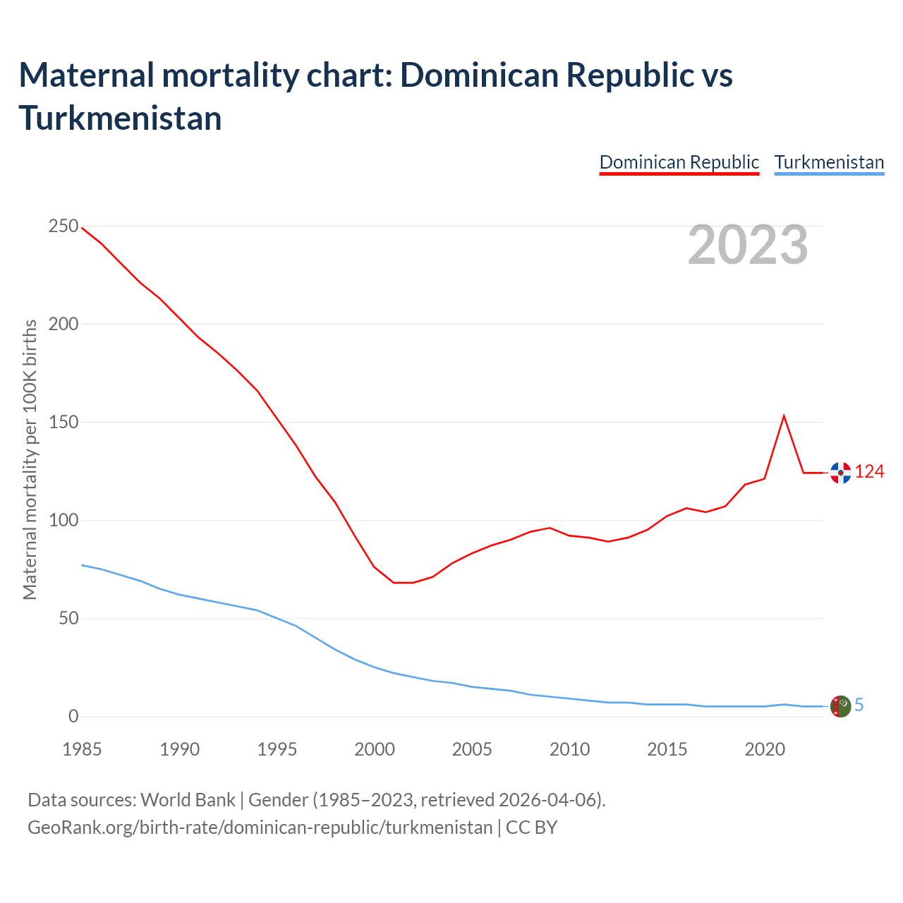 The maternal mortality rate, which is the probability of dying during childbirth or within 42 days of pregnancy termination, is 124 deaths per 100,000 live births in the Dominican Republic, compared to 5 deaths in Turkmenistan.