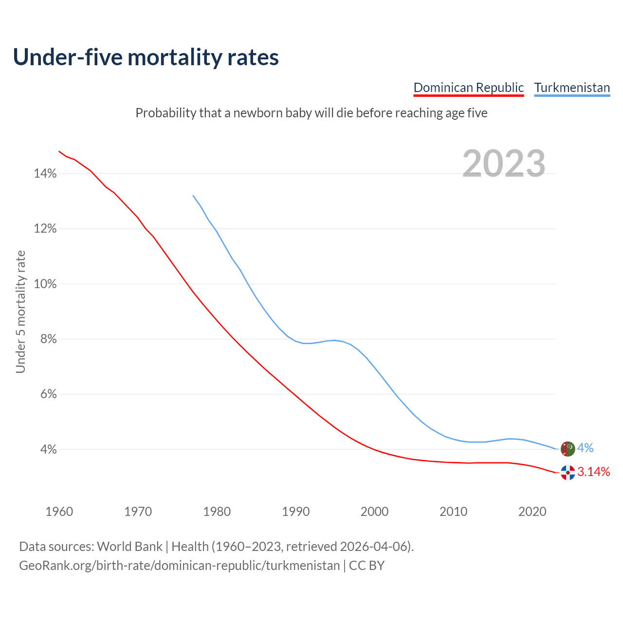 The chance that a newborn baby will die before reaching age five is 3.14% in the Dominican Republic and 4% in Turkmenistan. Above is a chart with historical data on under-five mortality rates.