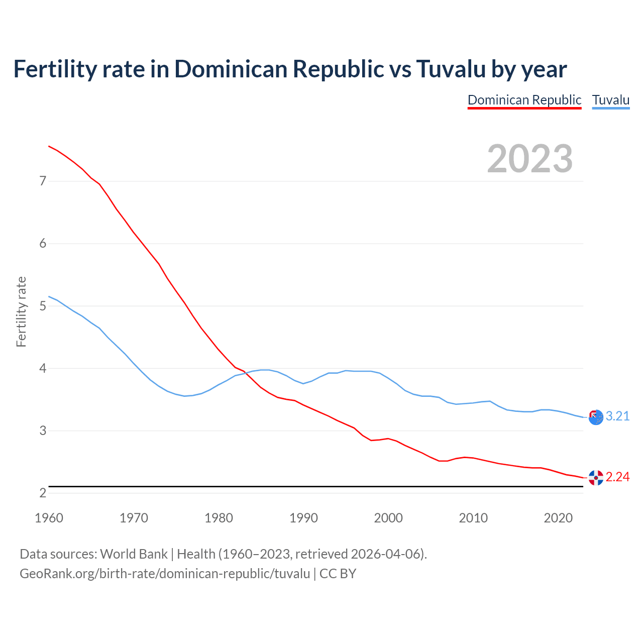 1960 vs 2023, the fertility rate has decreased by 70.3% in the Dominican Republic and by 37.7% in Tuvalu — in 1960, it was 7.56 and 5.15, respectively.