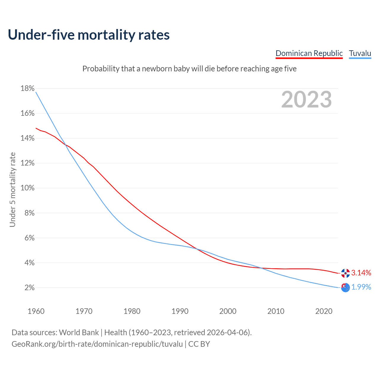 The chance that a newborn baby will die before reaching age five is 3.14% in the Dominican Republic and 1.99% in Tuvalu. Above is a chart with historical data on under-five mortality rates.