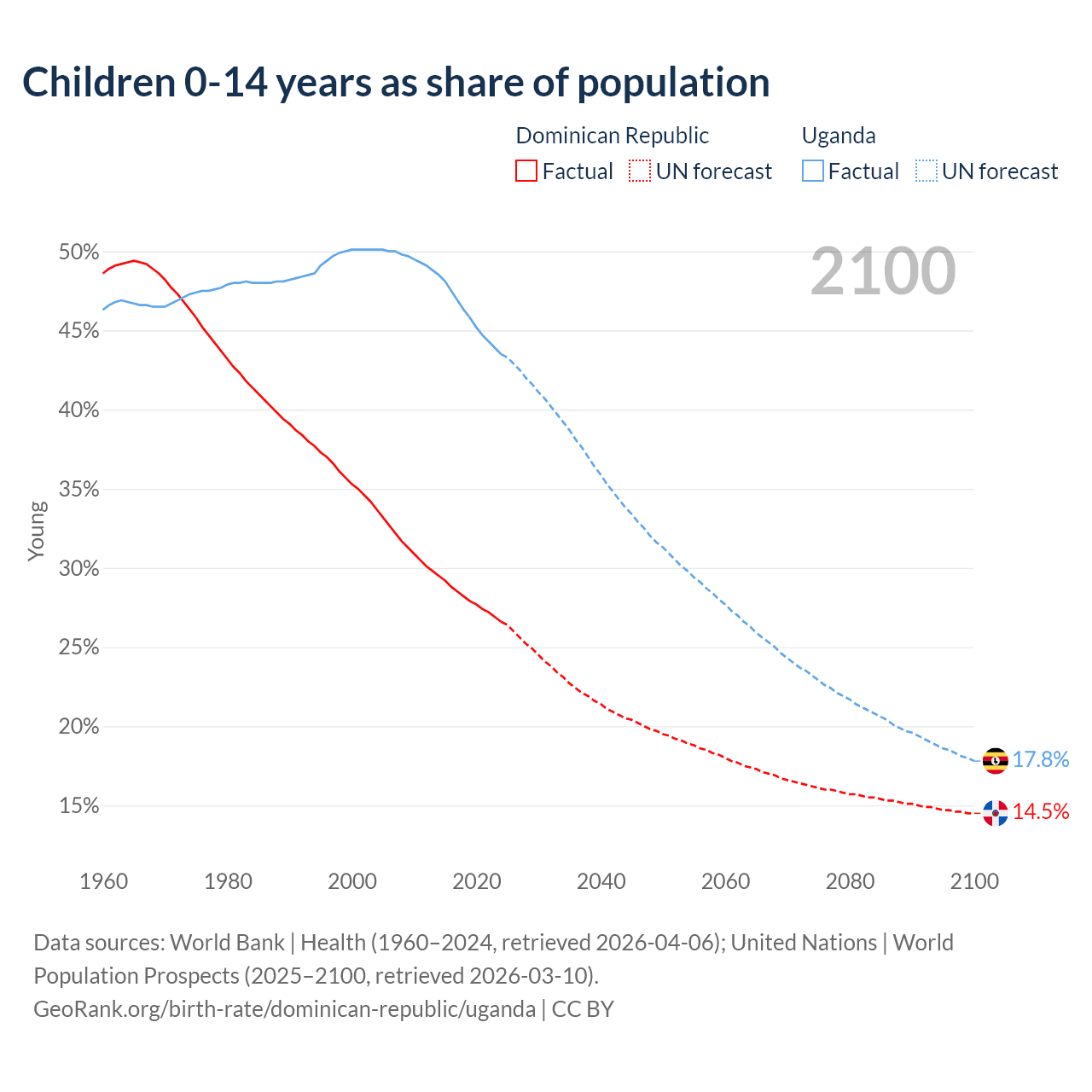 According to the latest available data on birth rates, the fertility rate in the Dominican Republic was 2.24 children per woman in 2023, compared to 4.28 in Uganda in 2023. The replacement level is considered to be 2.1 children per woman.
