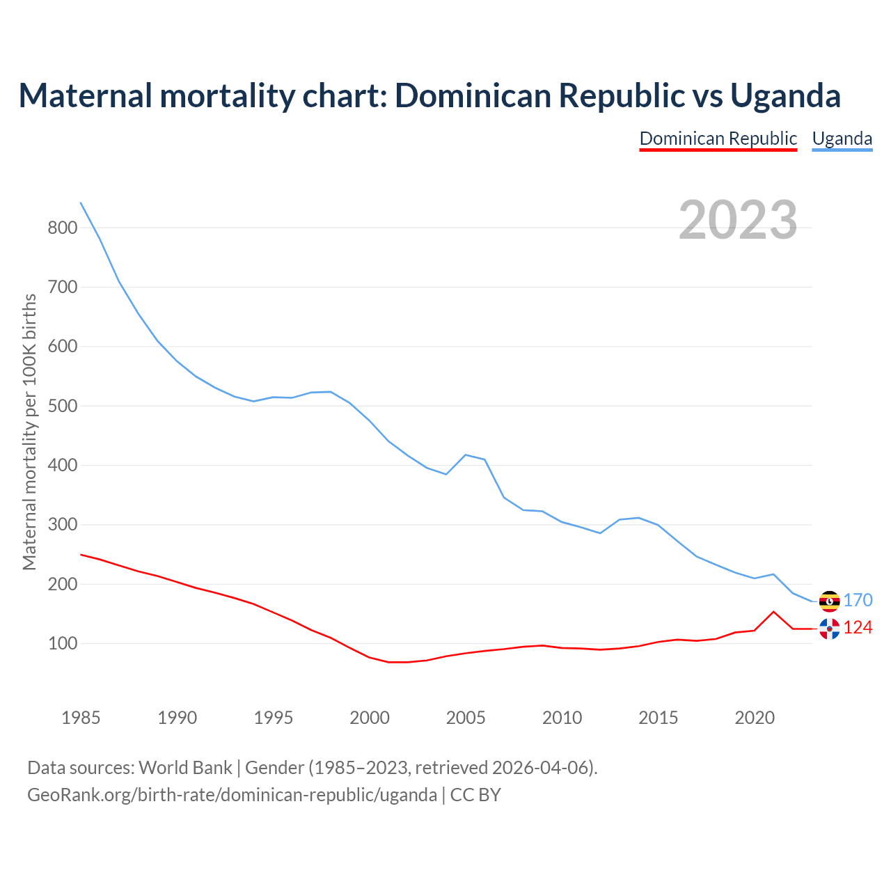 The maternal mortality rate, which is the probability of dying during childbirth or within 42 days of pregnancy termination, is 124 deaths per 100,000 live births in the Dominican Republic, compared to 170 deaths in Uganda.
