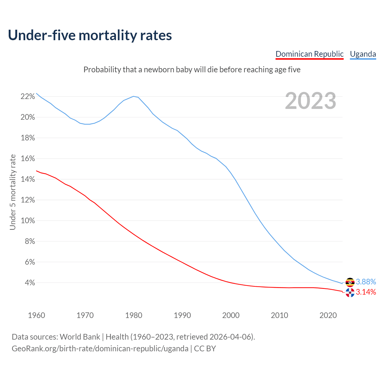 The chance that a newborn baby will die before reaching age five is 3.14% in the Dominican Republic and 3.88% in Uganda. Above is a chart with historical data on under-five mortality rates.