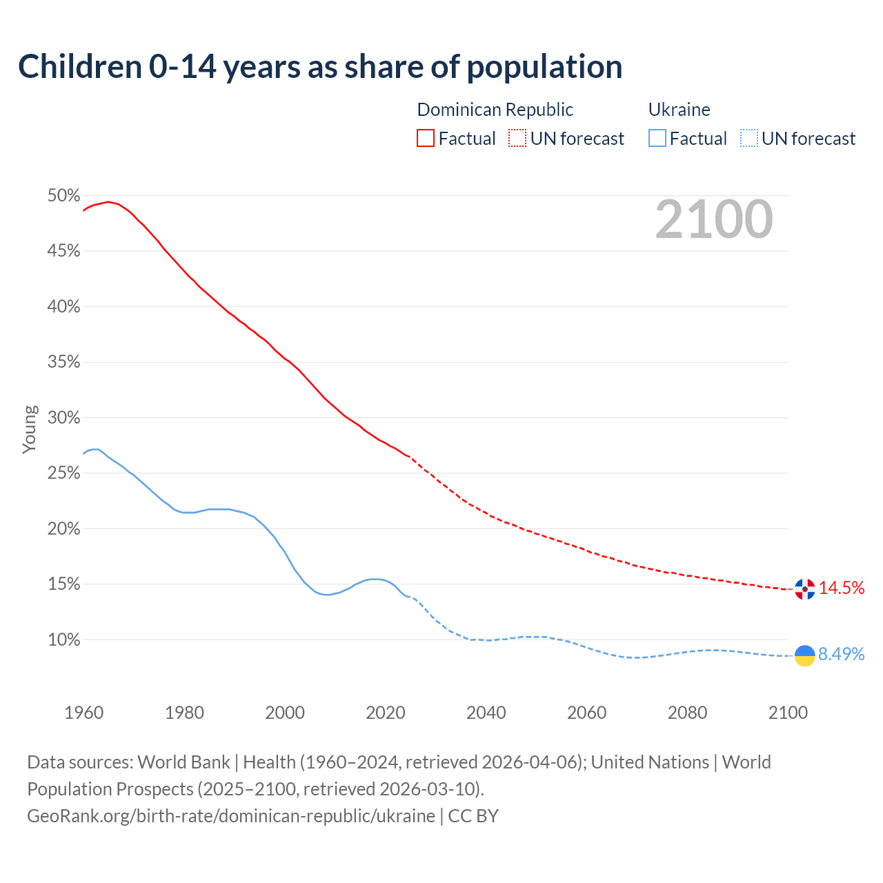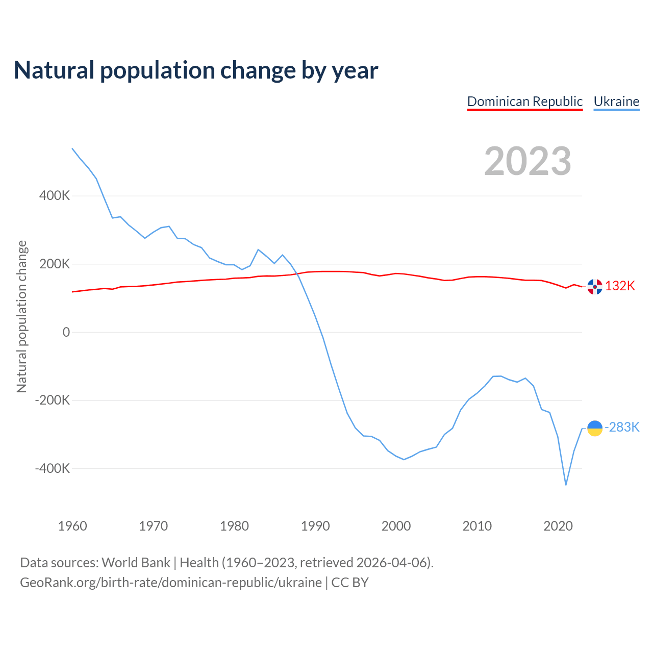 According to the latest available data on birth rates, the fertility rate in the Dominican Republic was 2.24 children per woman in 2023, compared to 0.98 in Ukraine in 2023. The replacement level is considered to be 2.1 children per woman.
