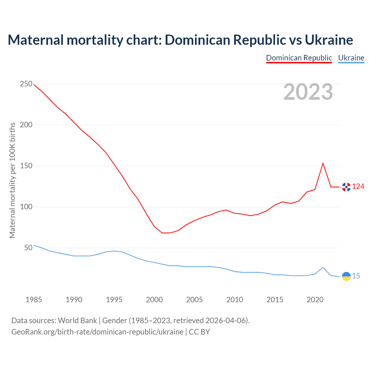 The maternal mortality rate, which is the probability of dying during childbirth or within 42 days of pregnancy termination, is 124 deaths per 100,000 live births in the Dominican Republic, compared to 15 deaths in Ukraine.