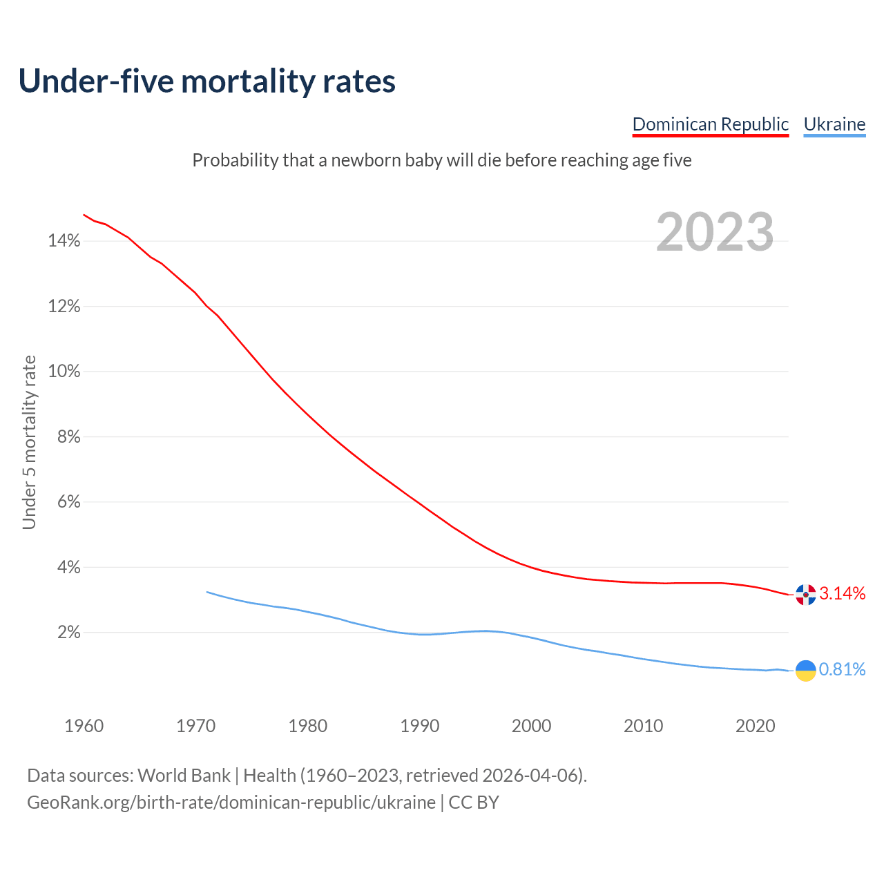 The chance that a newborn baby will die before reaching age five is 3.14% in the Dominican Republic and 0.81% in Ukraine. Above is a chart with historical data on under-five mortality rates.