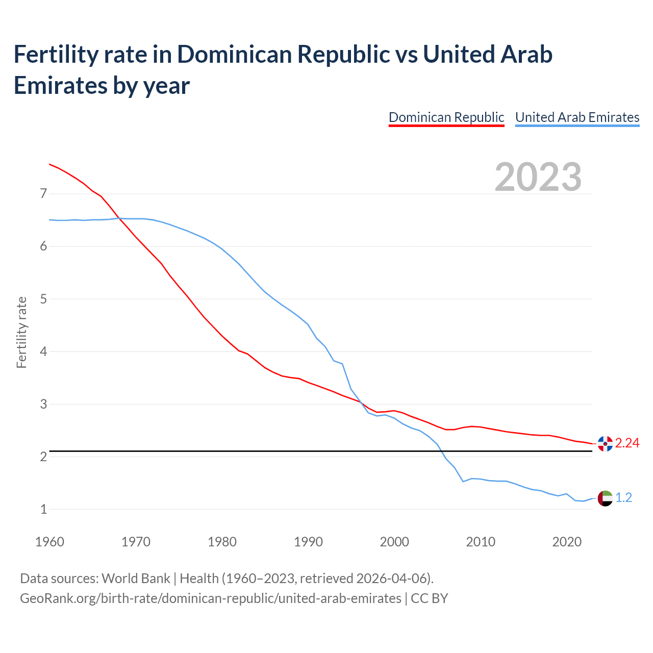 1960 vs 2023, the fertility rate has decreased by 70.3% in the Dominican Republic and by 81.5% in the United Arab Emirates — in 1960, it was 7.56 and 6.5, respectively.