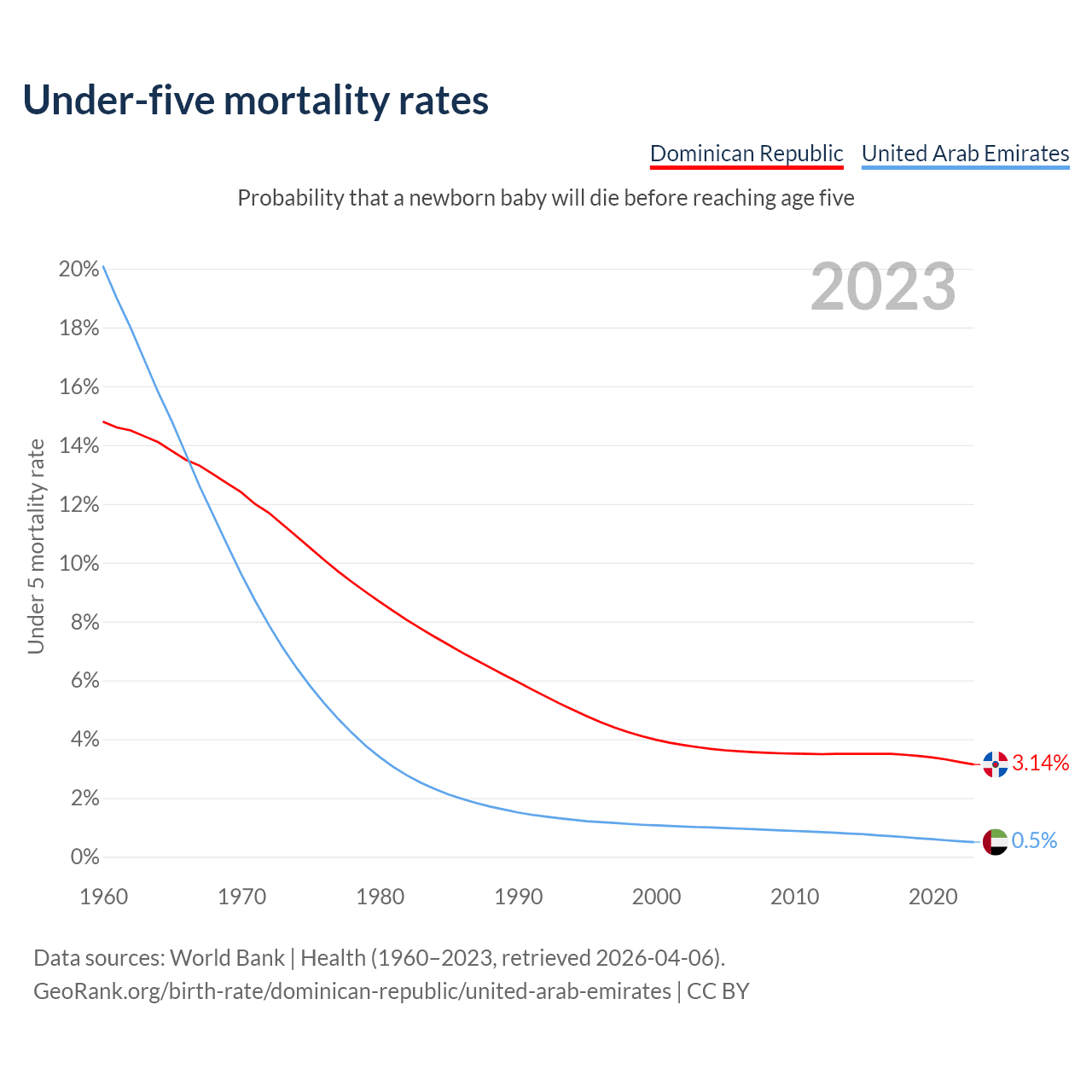 The chance that a newborn baby will die before reaching age five is 3.14% in the Dominican Republic and 0.5% in the United Arab Emirates. Above is a chart with historical data on under-five mortality rates.