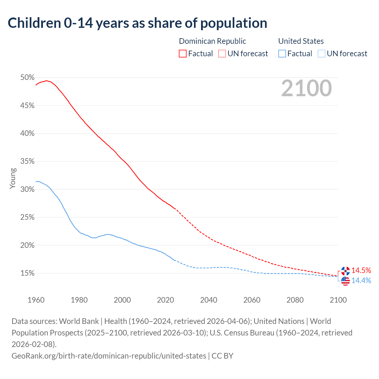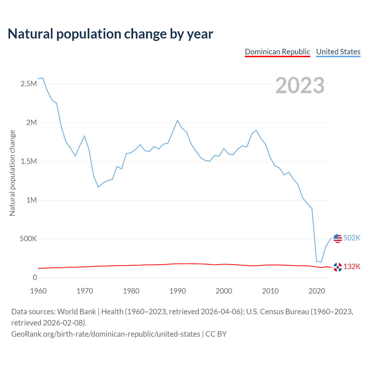 According to the latest available data on birth rates, the fertility rate in the Dominican Republic was 2.24 children per woman in 2023, compared to 1.62 in the United States in 2023. The replacement level is considered to be 2.1 children per woman.