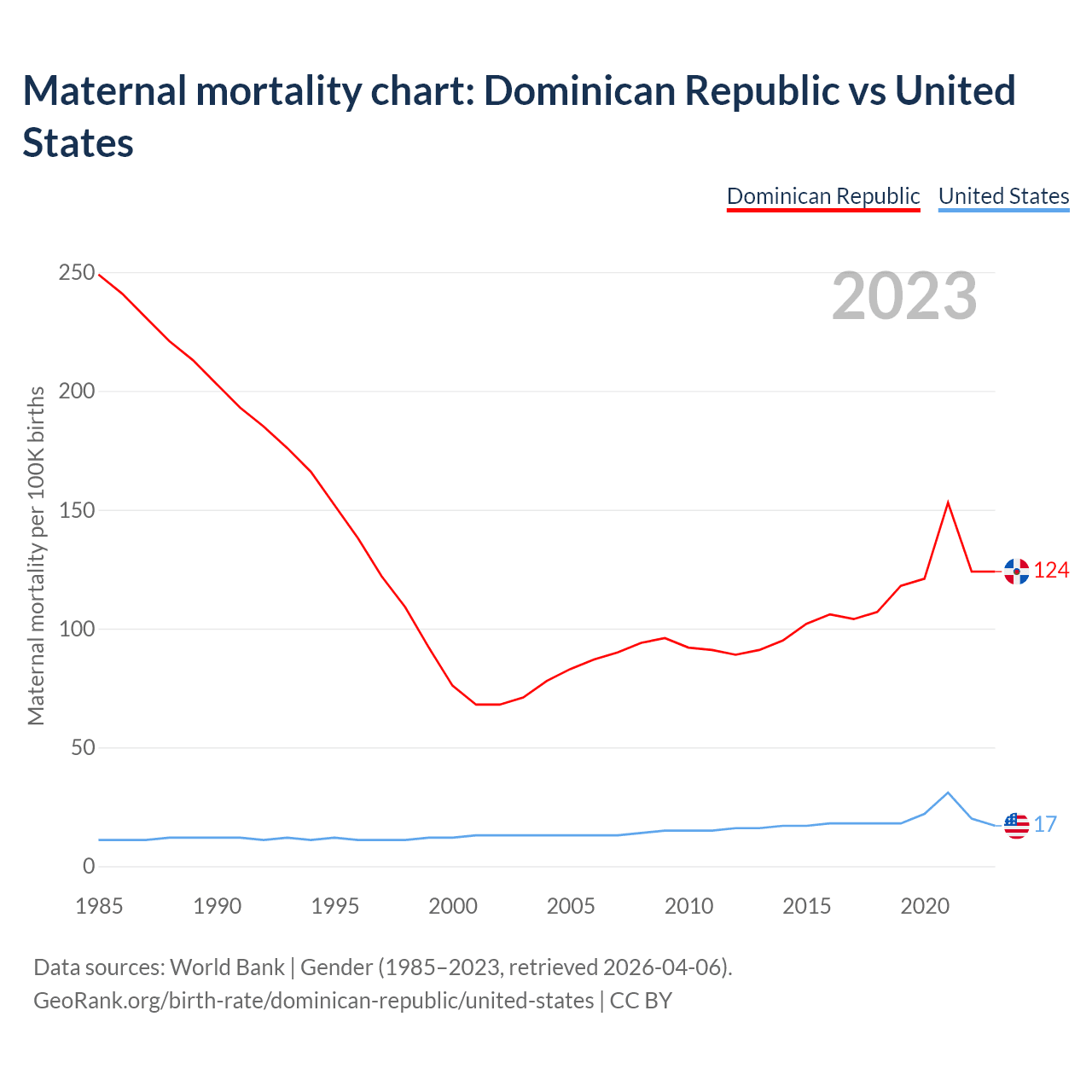 The maternal mortality rate, which is the probability of dying during childbirth or within 42 days of pregnancy termination, is 124 deaths per 100,000 live births in the Dominican Republic, compared to 17 deaths in the United States.