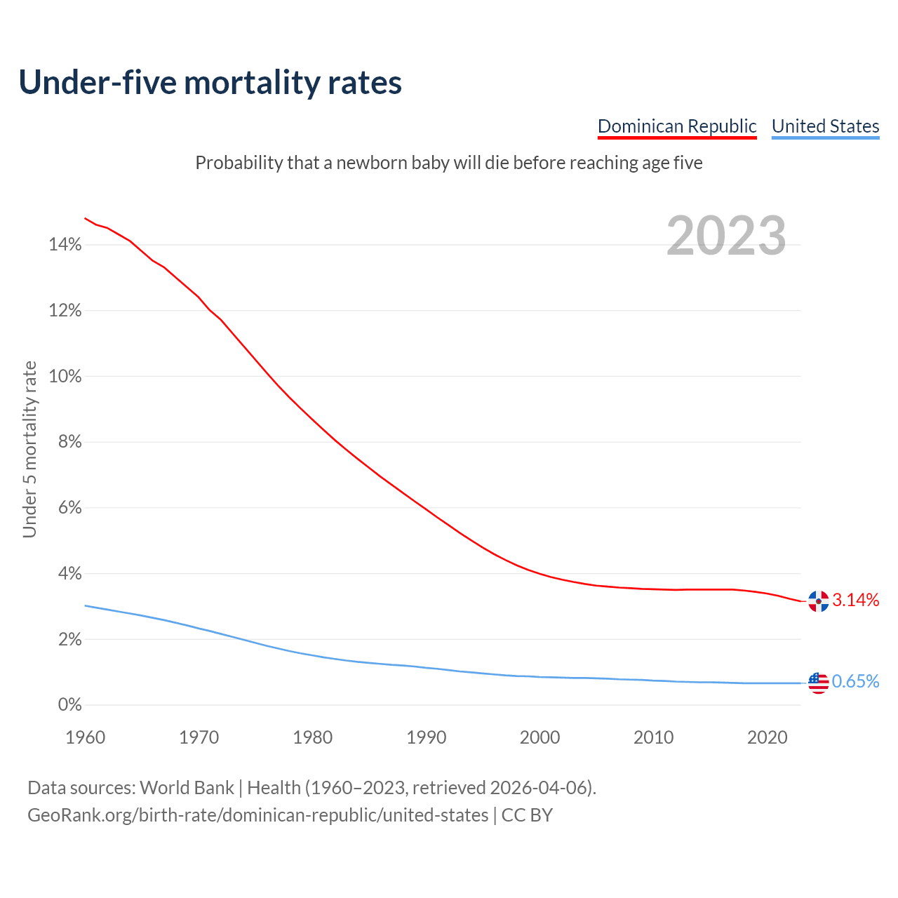The chance that a newborn baby will die before reaching age five is 3.14% in the Dominican Republic and 0.65% in the United States. Above is a chart with historical data on under-five mortality rates.