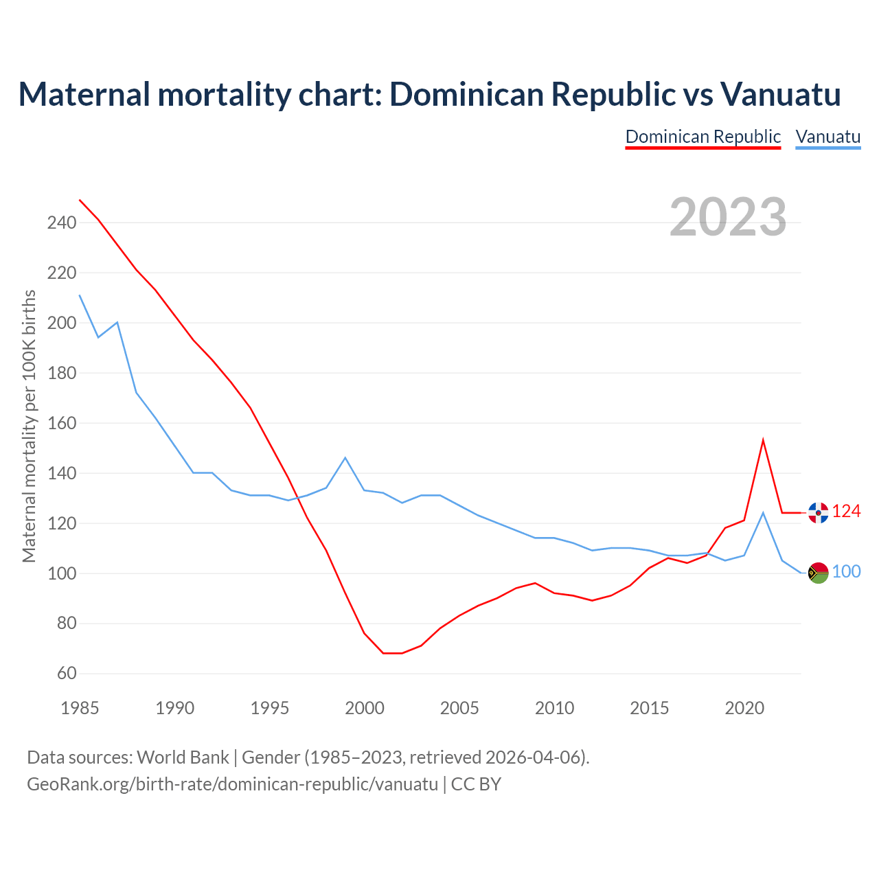 The maternal mortality rate, which is the probability of dying during childbirth or within 42 days of pregnancy termination, is 124 deaths per 100,000 live births in the Dominican Republic, compared to 100 deaths in Vanuatu.
