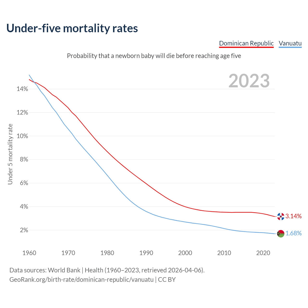 The chance that a newborn baby will die before reaching age five is 3.14% in the Dominican Republic and 1.68% in Vanuatu. Above is a chart with historical data on under-five mortality rates.