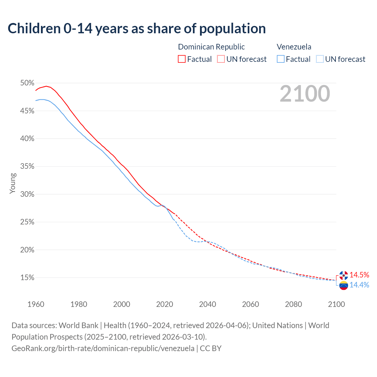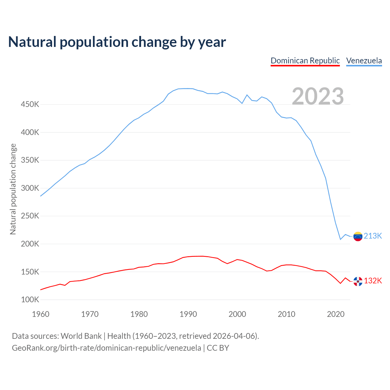 According to the latest available data on birth rates, the fertility rate in the Dominican Republic was 2.24 children per woman in 2023, compared to 2.08 in Venezuela in 2023. The replacement level is considered to be 2.1 children per woman.