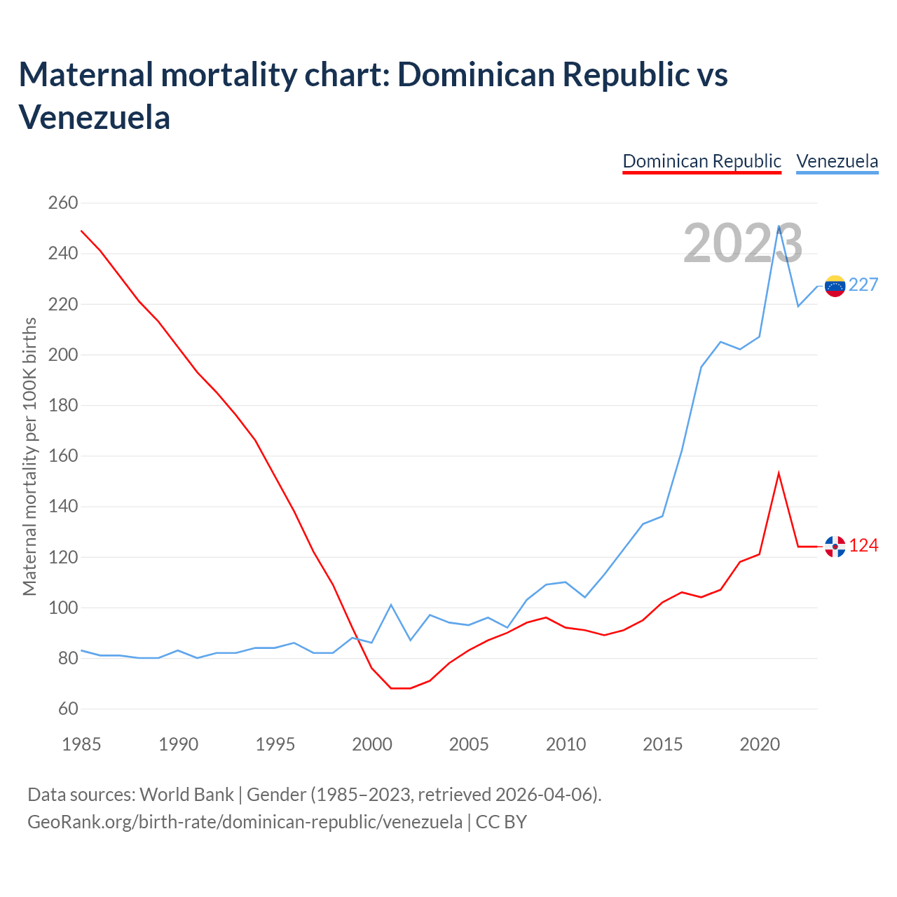The maternal mortality rate, which is the probability of dying during childbirth or within 42 days of pregnancy termination, is 124 deaths per 100,000 live births in the Dominican Republic, compared to 227 deaths in Venezuela.