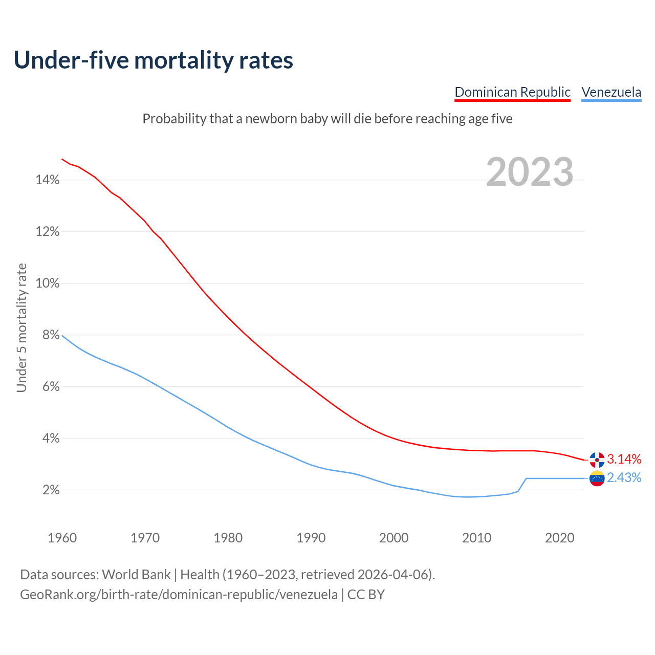 The chance that a newborn baby will die before reaching age five is 3.14% in the Dominican Republic and 2.43% in Venezuela. Above is a chart with historical data on under-five mortality rates.