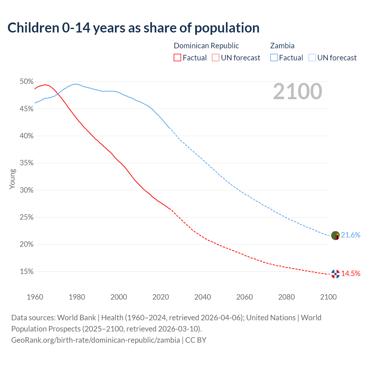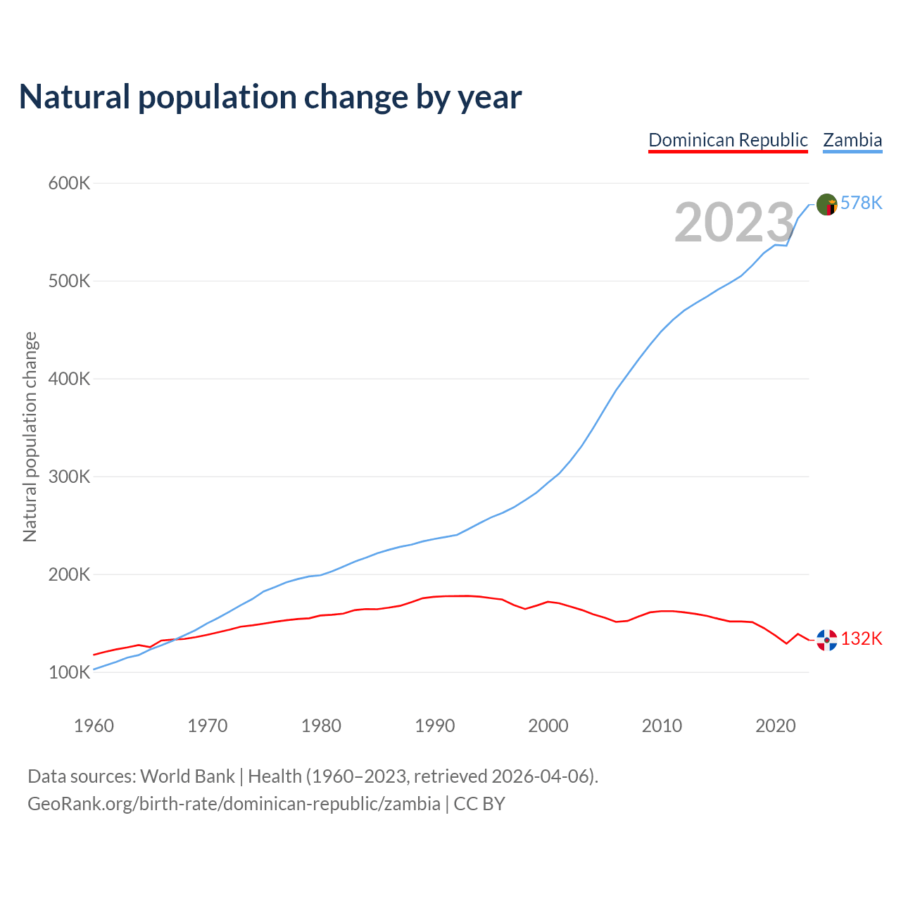 The Dominican Republic has an annual birth rate of 17.9 births per 1,000 people, compared to 33.1 for Zambia. The average number of children a woman is expected to have during her lifetime — the fertility rate, is 2.24 in the Dominican Republic and 4.1 in Zambia — 82.8% difference.