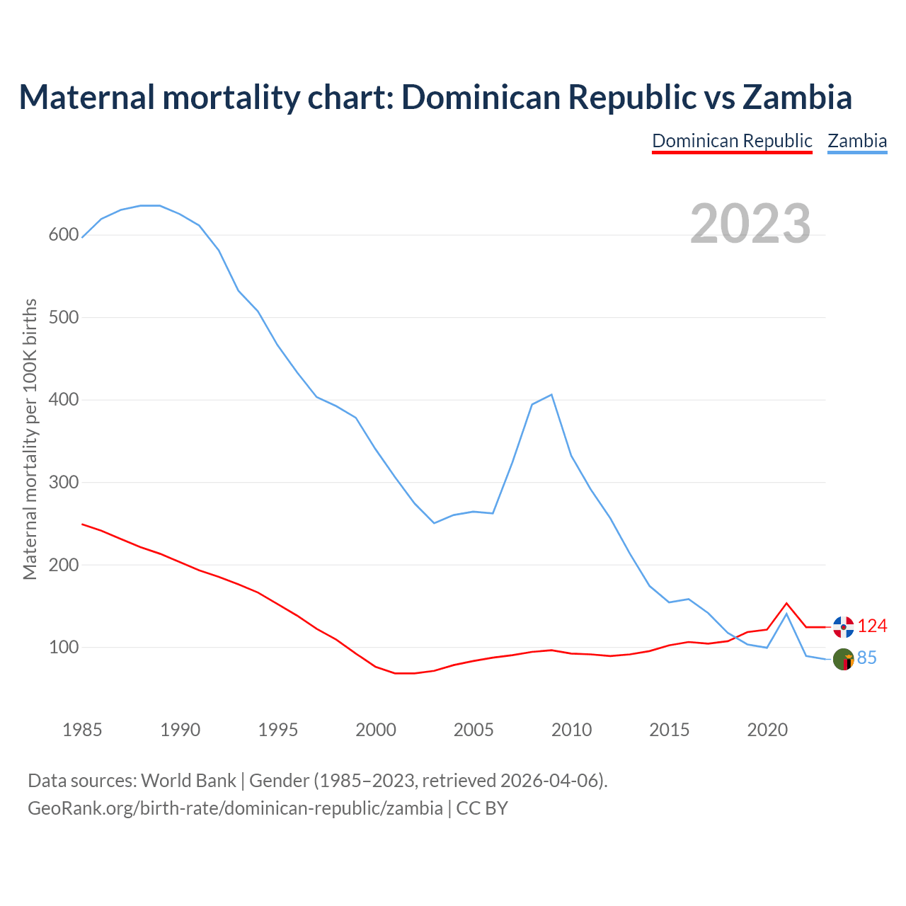 The maternal mortality rate, which is the probability of dying during childbirth or within 42 days of pregnancy termination, is 124 deaths per 100,000 live births in the Dominican Republic, compared to 85 deaths in Zambia.