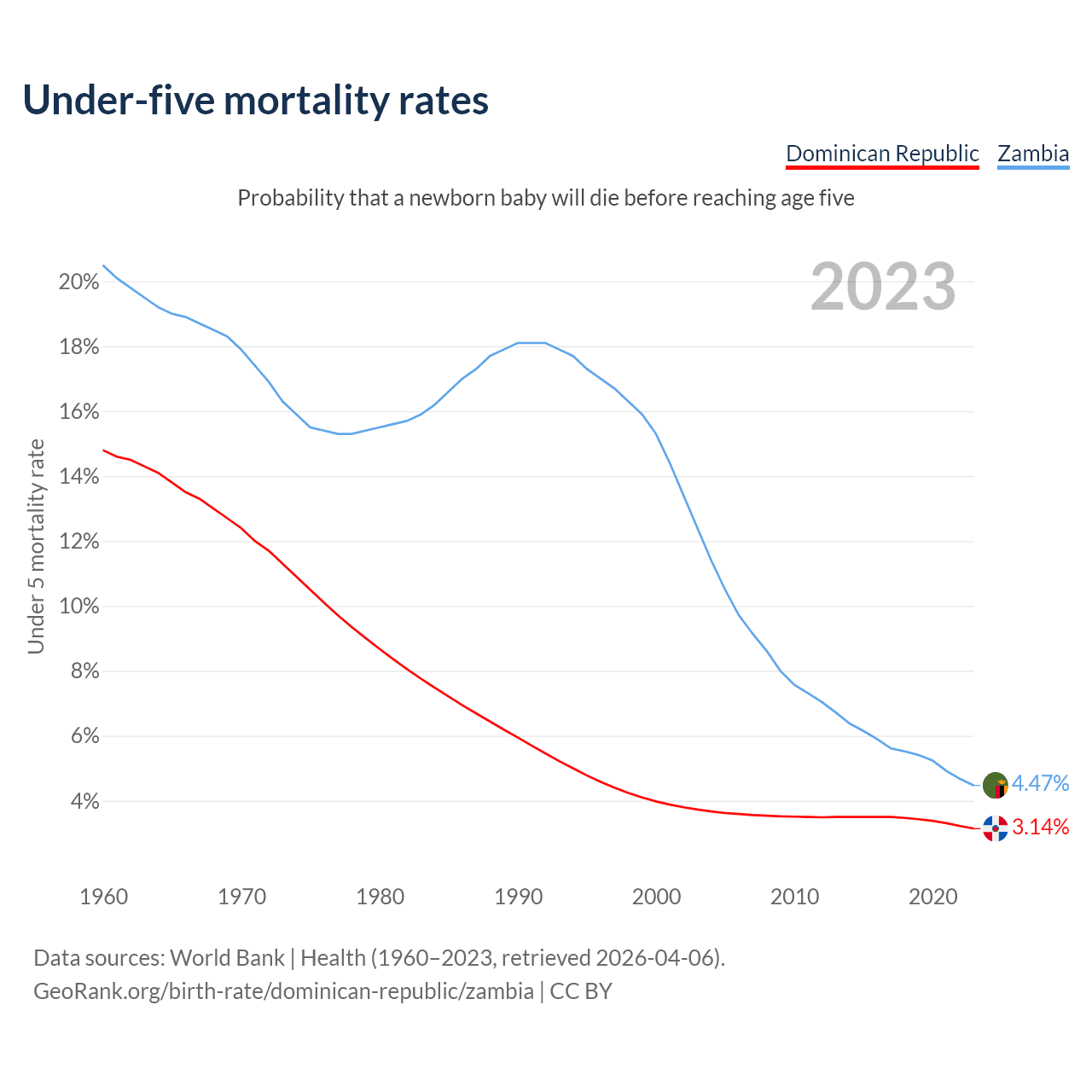 The chance that a newborn baby will die before reaching age five is 3.14% in the Dominican Republic and 4.47% in Zambia. Above is a chart with historical data on under-five mortality rates.