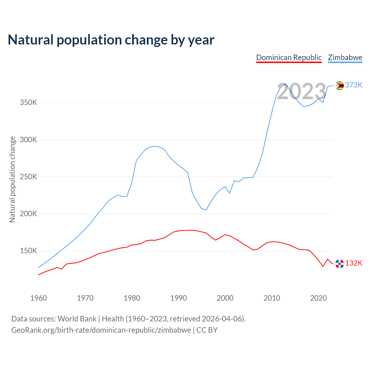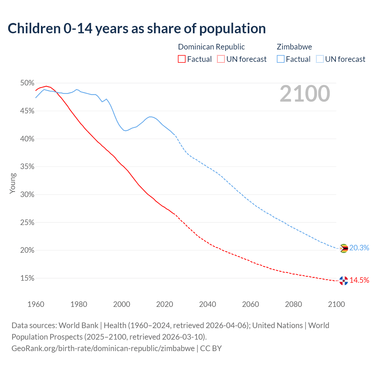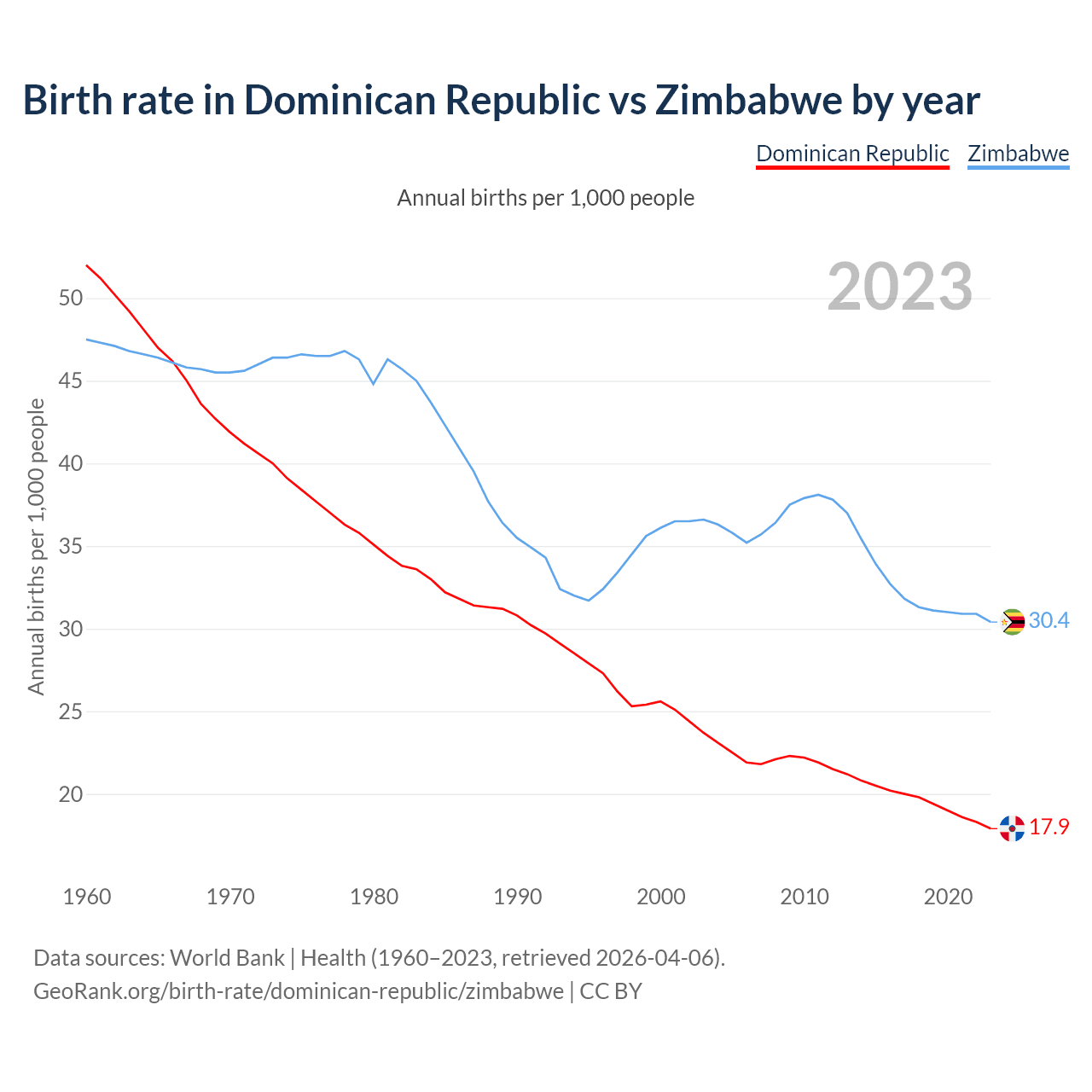 The Dominican Republic has an annual birth rate of 17.9 births per 1,000 people, compared to 30.4 for Zimbabwe. The average number of children a woman is expected to have during her lifetime — the fertility rate, is 2.24 in the Dominican Republic and 3.72 in Zimbabwe — 66% difference.