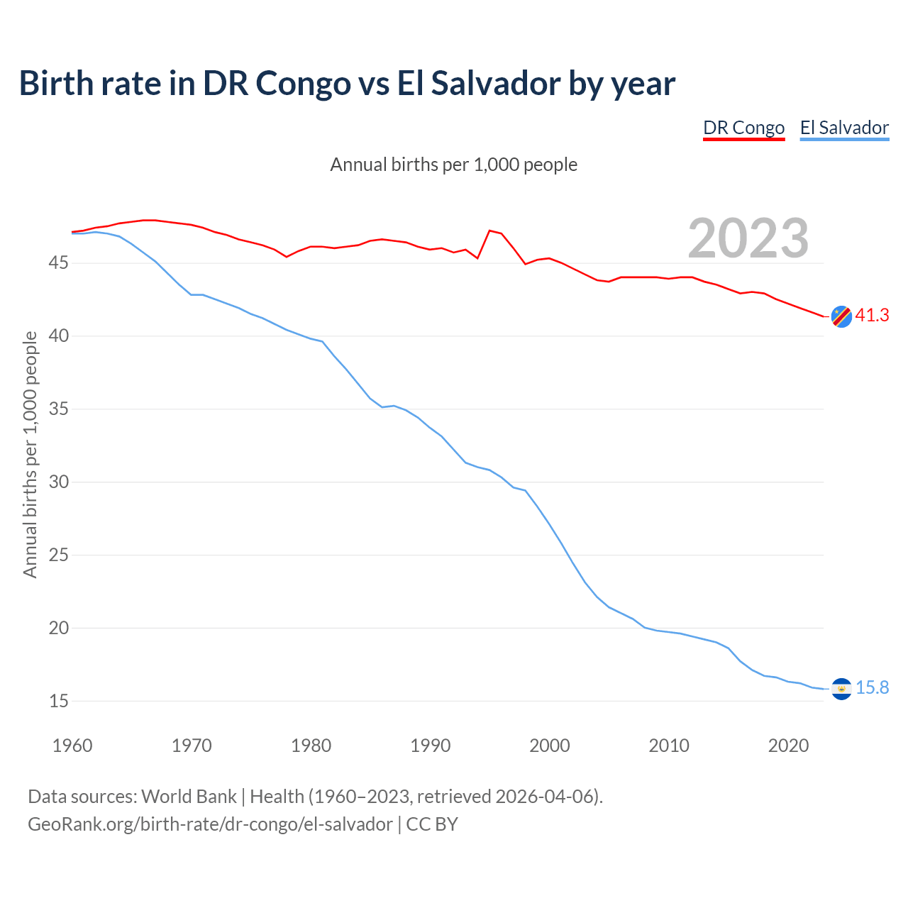The DR Congo has an annual birth rate of 41.3 births per 1,000 people, compared to 15.8 for El Salvador. The average number of children a woman is expected to have during her lifetime — the fertility rate, is 6.05 in the DR Congo and 1.78 in El Salvador — 70.7% difference.