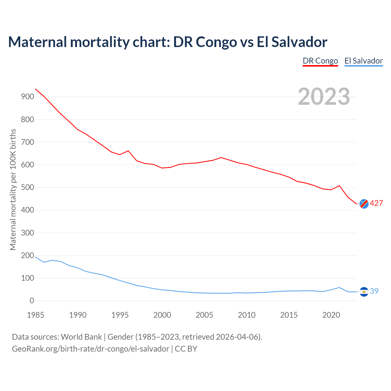 The maternal mortality rate, which is the probability of dying during childbirth or within 42 days of pregnancy termination, is 427 deaths per 100,000 live births in the DR Congo, compared to 39 deaths in El Salvador.