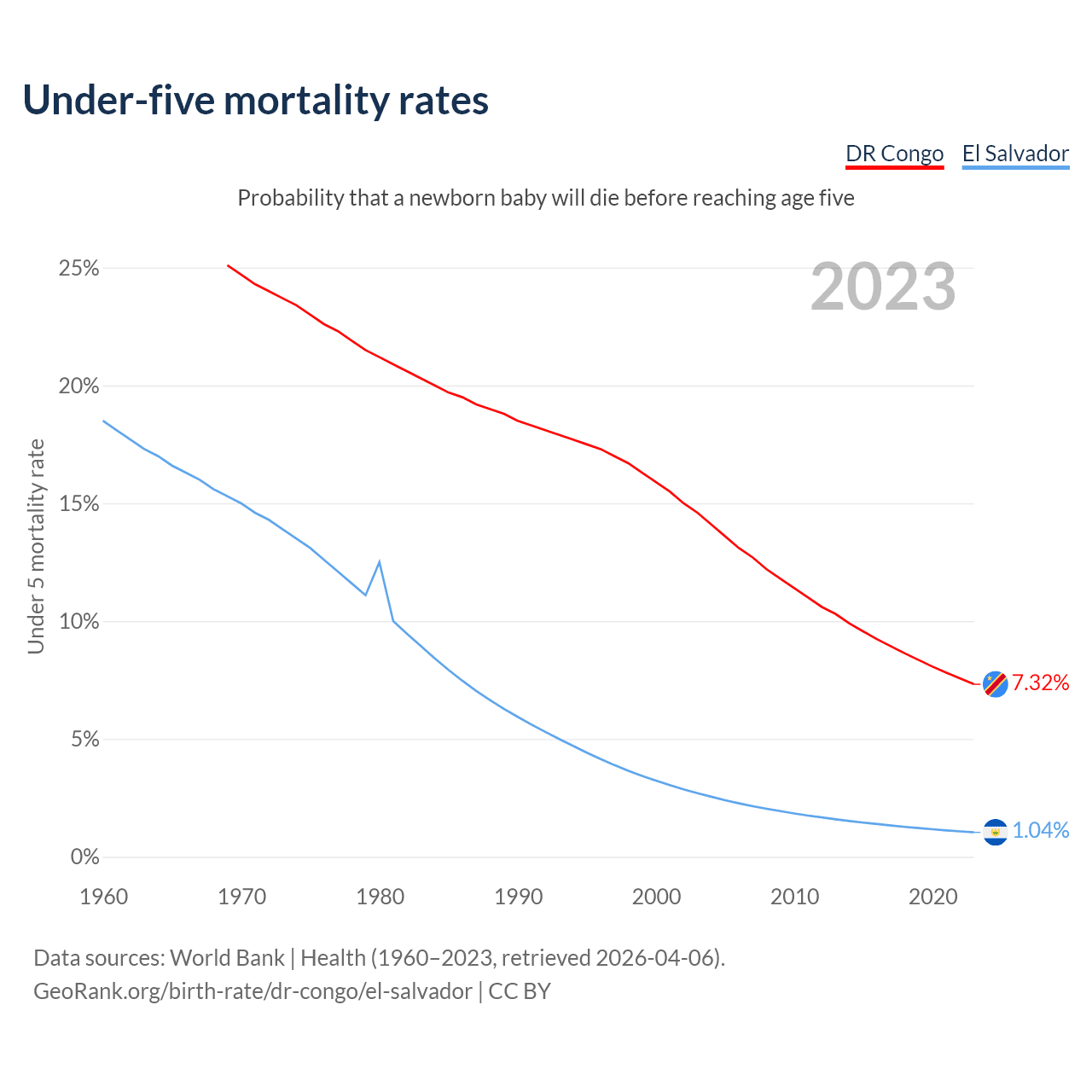 The chance that a newborn baby will die before reaching age five is 7.32% in the DR Congo and 1.04% in El Salvador. Above is a chart with historical data on under-five mortality rates.