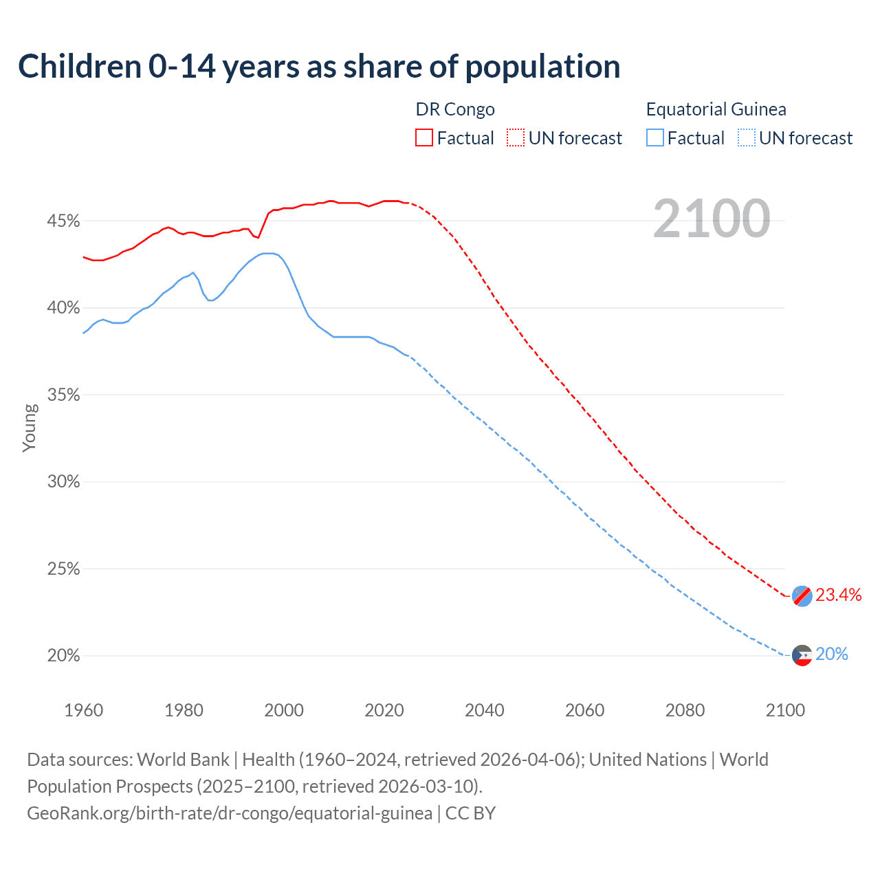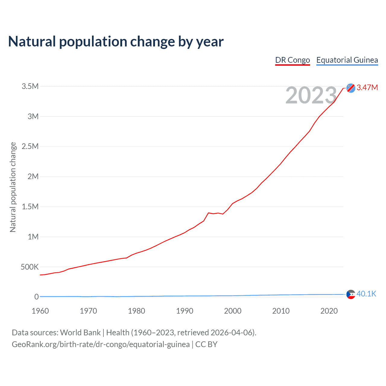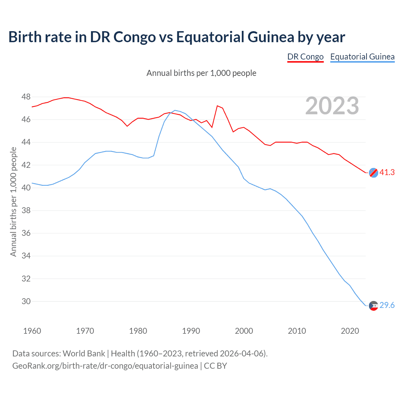 According to the latest available data on birth rates, the fertility rate in the DR Congo was 6.05 children per woman in 2023, compared to 4.08 in Equatorial Guinea in 2023. The replacement level is considered to be 2.1 children per woman.