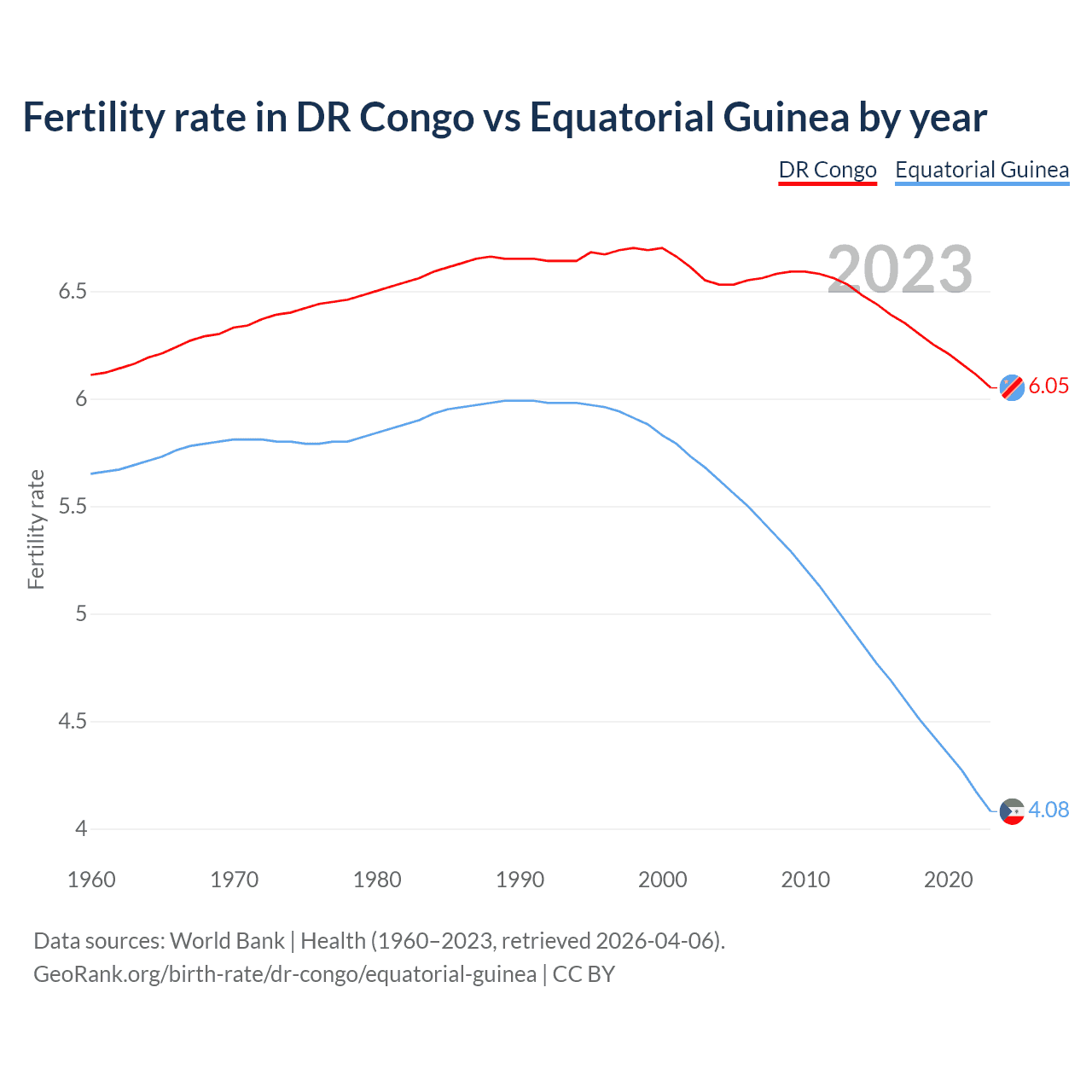 1960 vs 2023, the fertility rate has decreased by 0.88% in the DR Congo and by 27.8% in Equatorial Guinea — in 1960, it was 6.11 and 5.65, respectively.