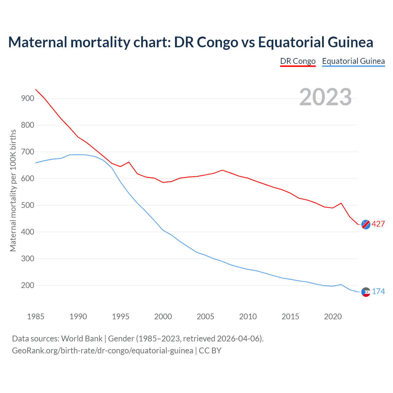 The maternal mortality rate, which is the probability of dying during childbirth or within 42 days of pregnancy termination, is 427 deaths per 100,000 live births in the DR Congo, compared to 174 deaths in Equatorial Guinea.