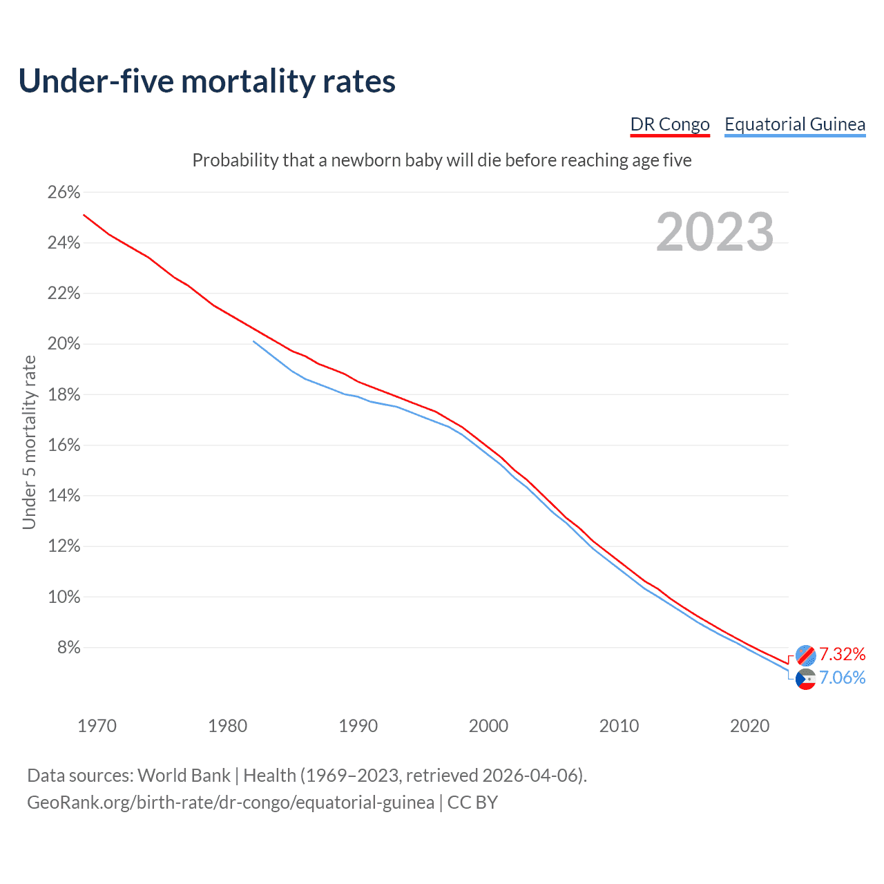 The chance that a newborn baby will die before reaching age five is 7.32% in the DR Congo and 7.06% in Equatorial Guinea. Above is a chart with historical data on under-five mortality rates.