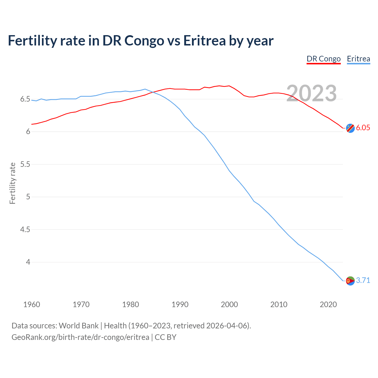 Fertility rate in DR Congo vs Eritrea by year
