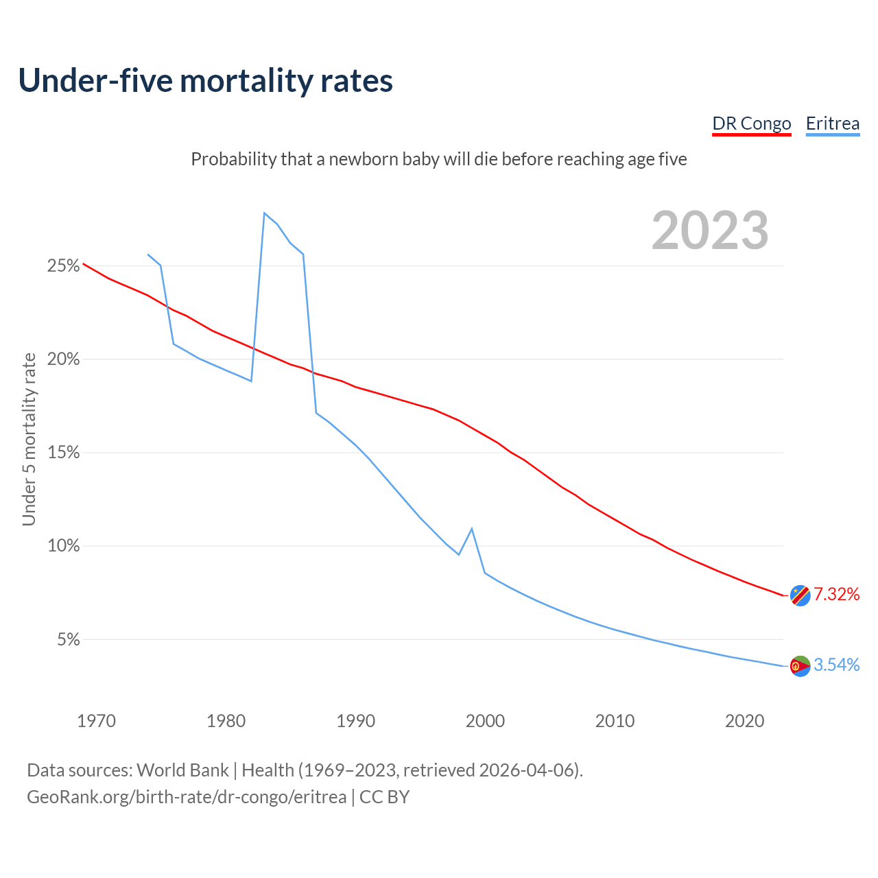 The chance that a newborn baby will die before reaching age five is 7.32% in the DR Congo and 3.54% in Eritrea. Above is a chart with historical data on under-five mortality rates.