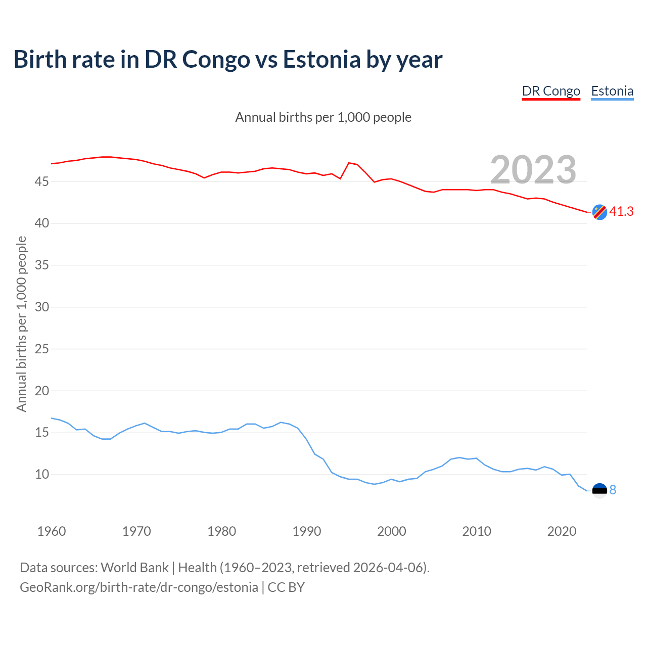 According to the latest available data on birth rates, the fertility rate in the DR Congo was 6.05 children per woman in 2023, compared to 1.31 in Estonia in 2023. The replacement level is considered to be 2.1 children per woman.