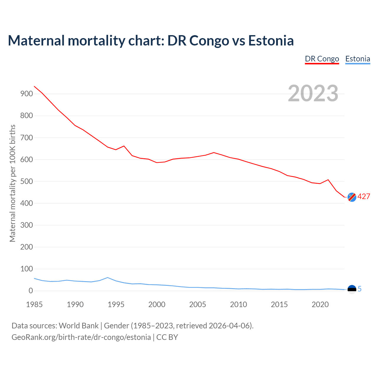 The maternal mortality rate, which is the probability of dying during childbirth or within 42 days of pregnancy termination, is 427 deaths per 100,000 live births in the DR Congo, compared to 5 deaths in Estonia.