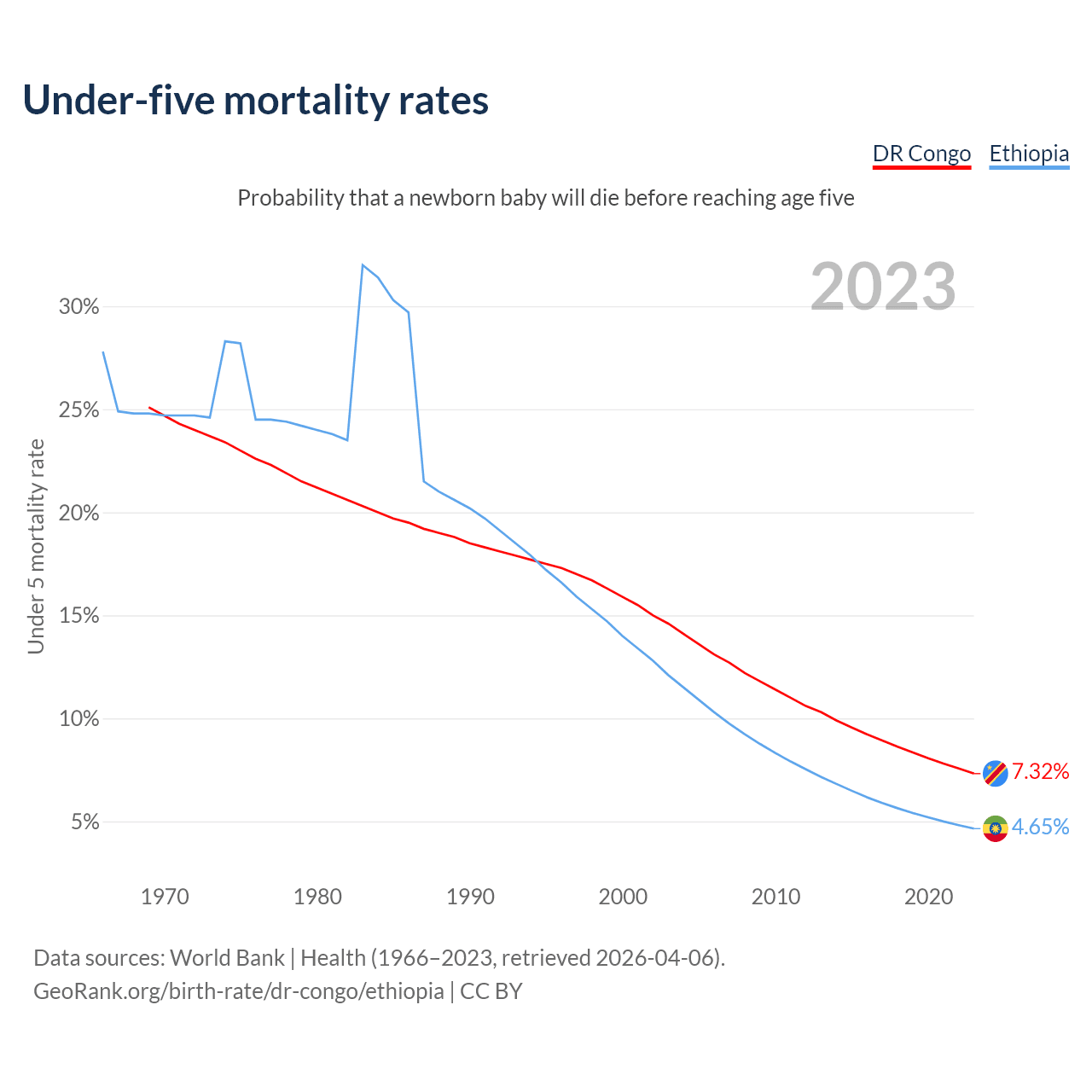 The chance that a newborn baby will die before reaching age five is 7.32% in the DR Congo and 4.65% in Ethiopia. Above is a chart with historical data on under-five mortality rates.