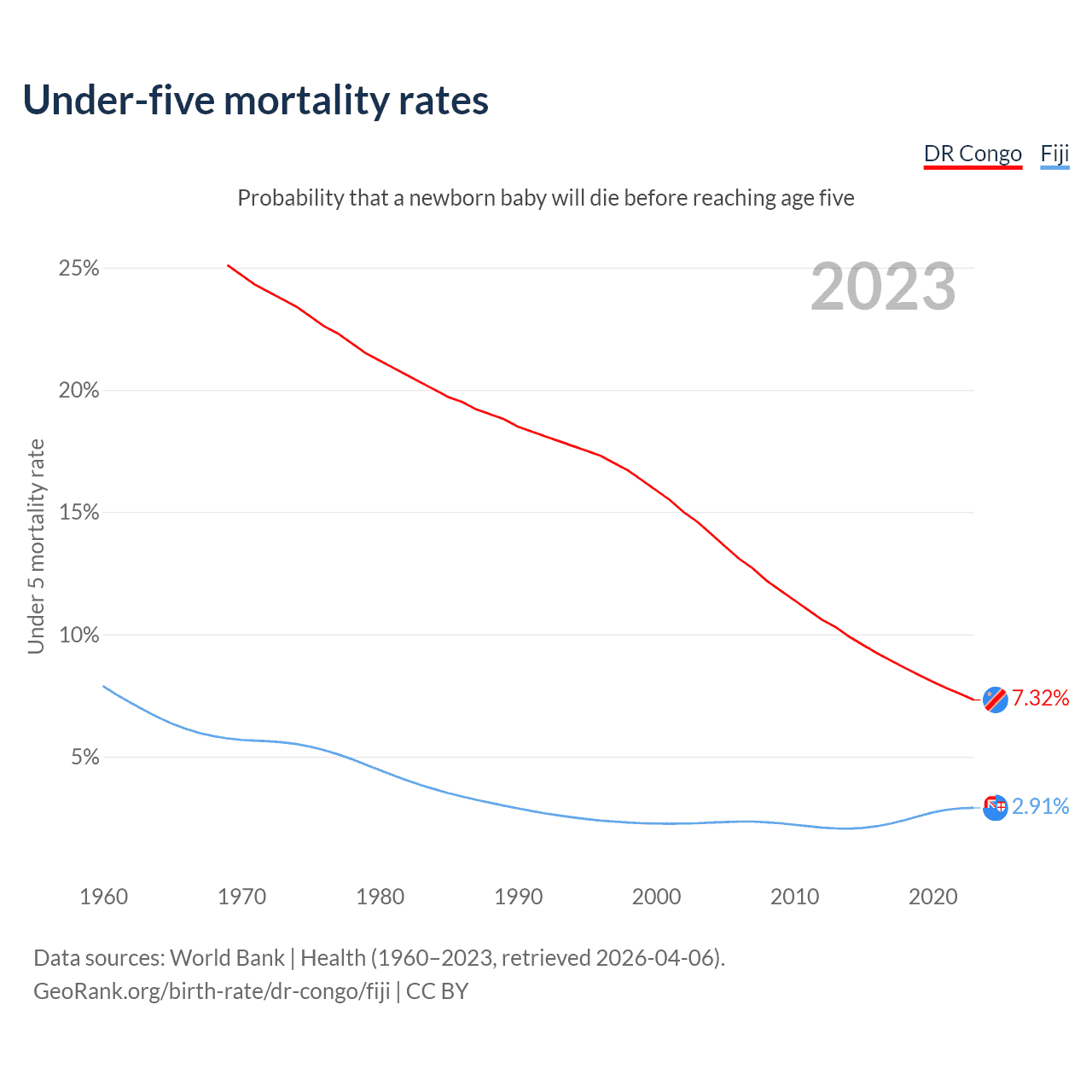 The chance that a newborn baby will die before reaching age five is 7.32% in the DR Congo and 2.91% in Fiji. Above is a chart with historical data on under-five mortality rates.