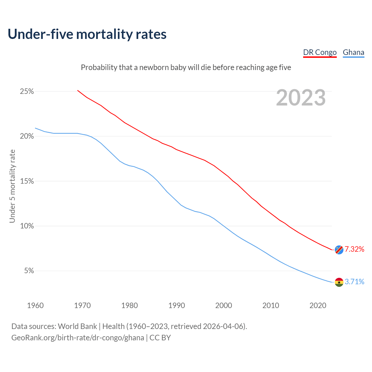 The chance that a newborn baby will die before reaching age five is 7.32% in the DR Congo and 3.71% in Ghana. Above is a chart with historical data on under-five mortality rates.