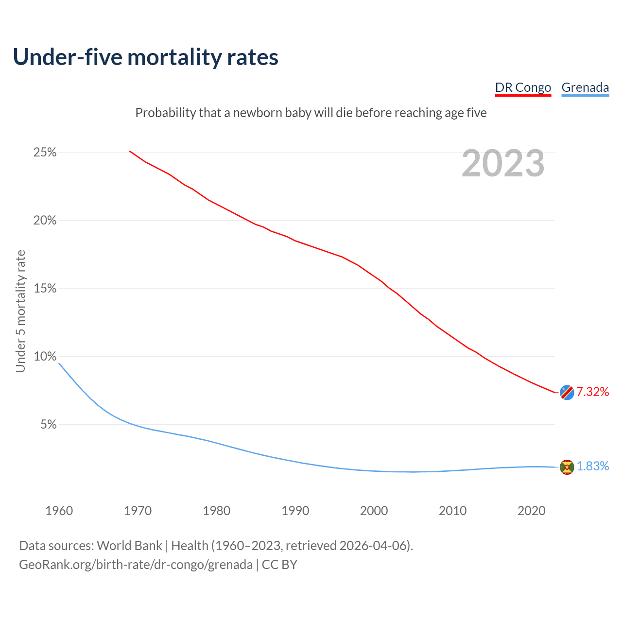 The chance that a newborn baby will die before reaching age five is 7.32% in the DR Congo and 1.83% in Grenada. Above is a chart with historical data on under-five mortality rates.