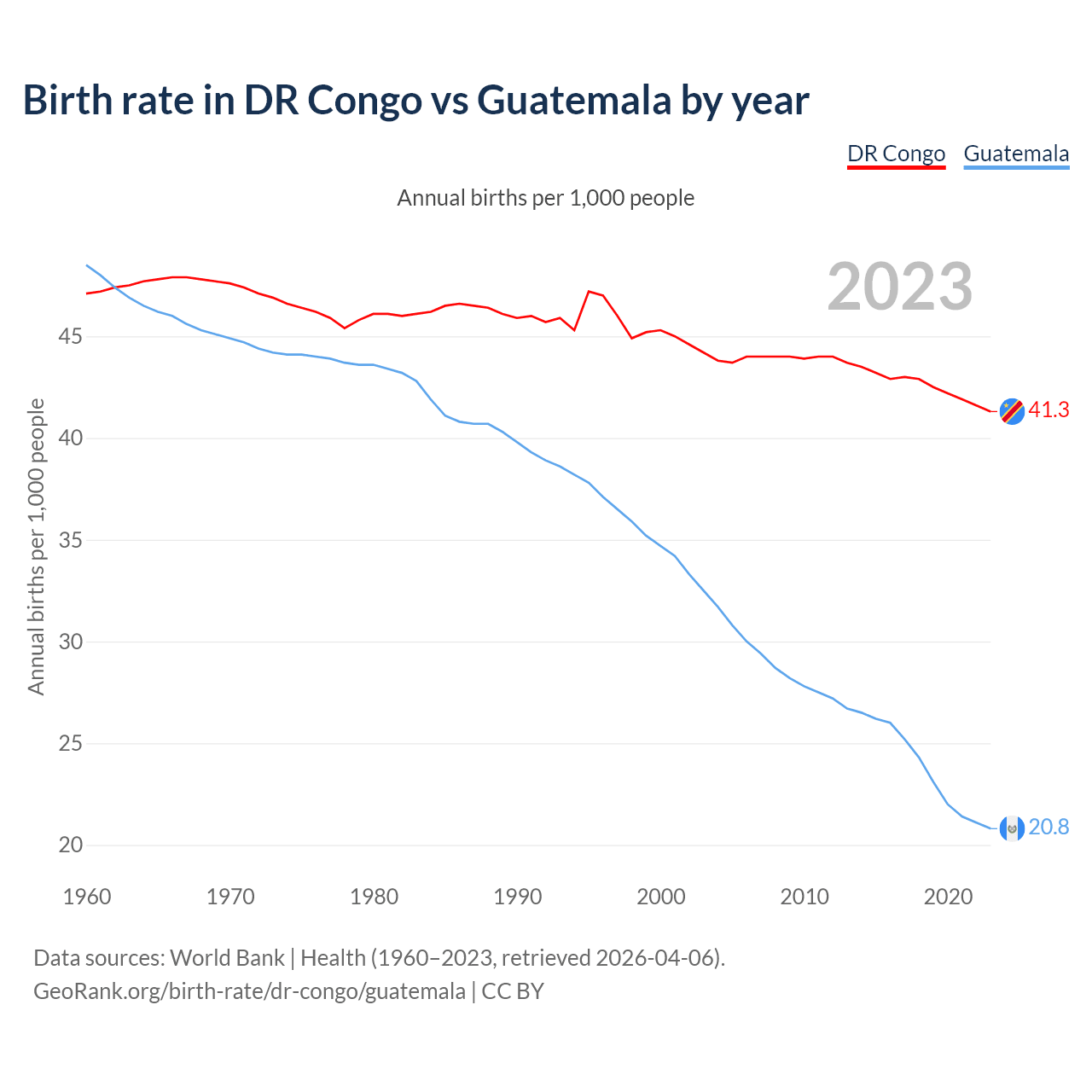 The DR Congo has an annual birth rate of 41.3 births per 1,000 people, compared to 20.8 for Guatemala. The average number of children a woman is expected to have during her lifetime — the fertility rate, is 6.05 in the DR Congo and 2.31 in Guatemala — 61.8% difference.