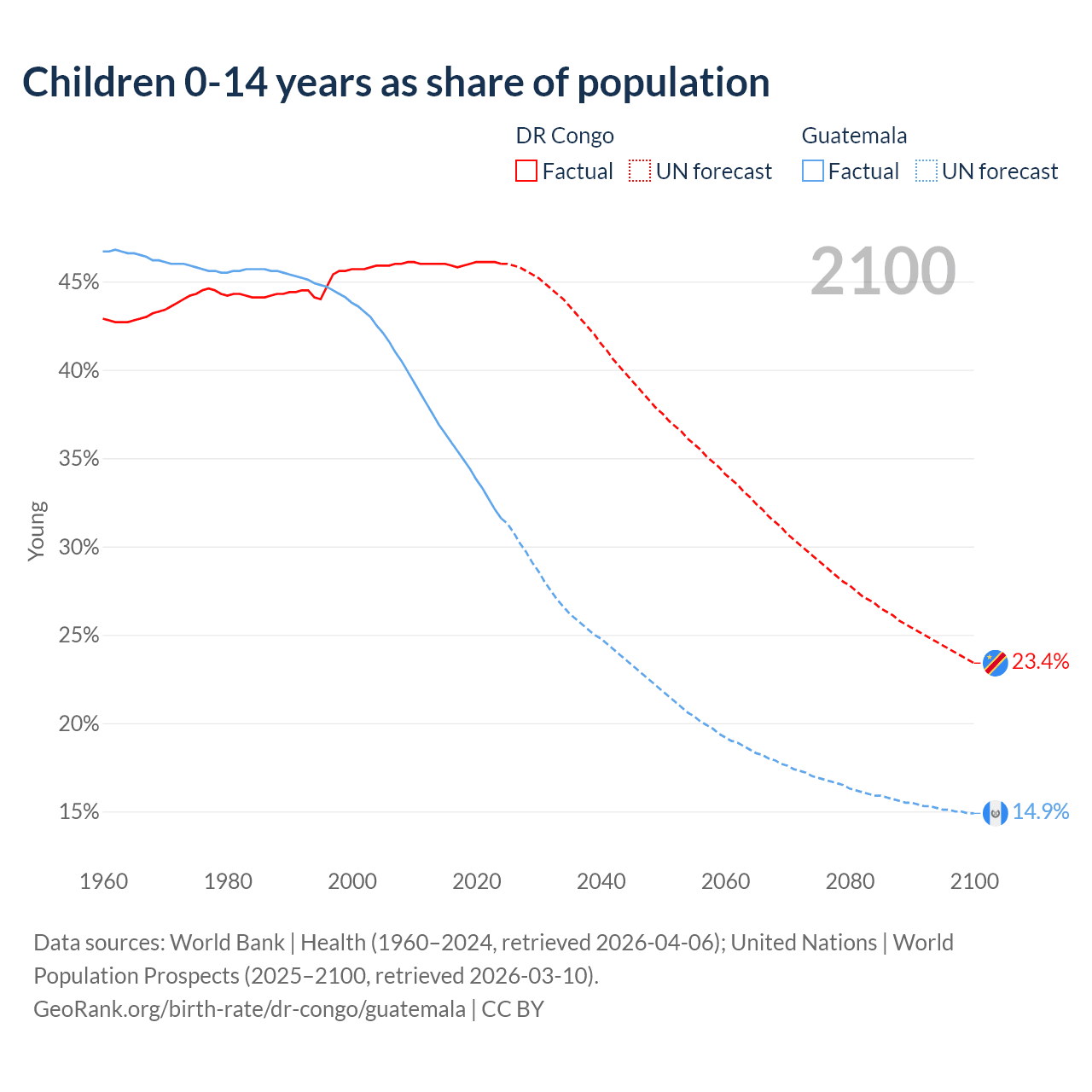 According to the latest available data on birth rates, the fertility rate in the DR Congo was 6.05 children per woman in 2023, compared to 2.31 in Guatemala in 2023. The replacement level is considered to be 2.1 children per woman.