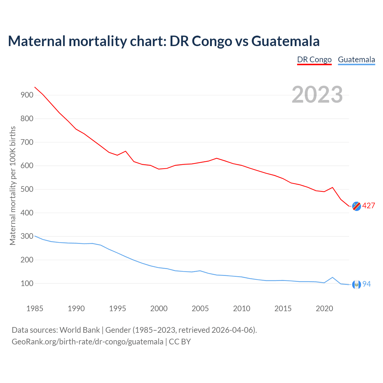 The maternal mortality rate, which is the probability of dying during childbirth or within 42 days of pregnancy termination, is 427 deaths per 100,000 live births in the DR Congo, compared to 94 deaths in Guatemala.