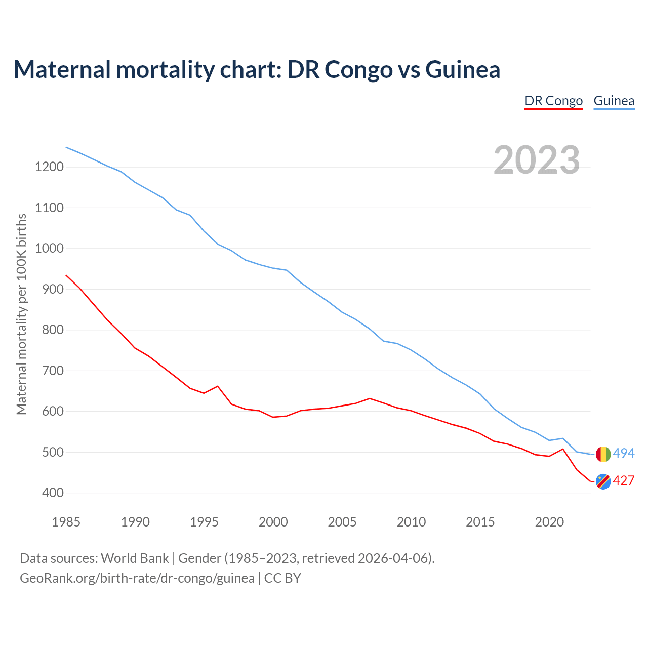 The maternal mortality rate, which is the probability of dying during childbirth or within 42 days of pregnancy termination, is 427 deaths per 100,000 live births in the DR Congo, compared to 494 deaths in Guinea.