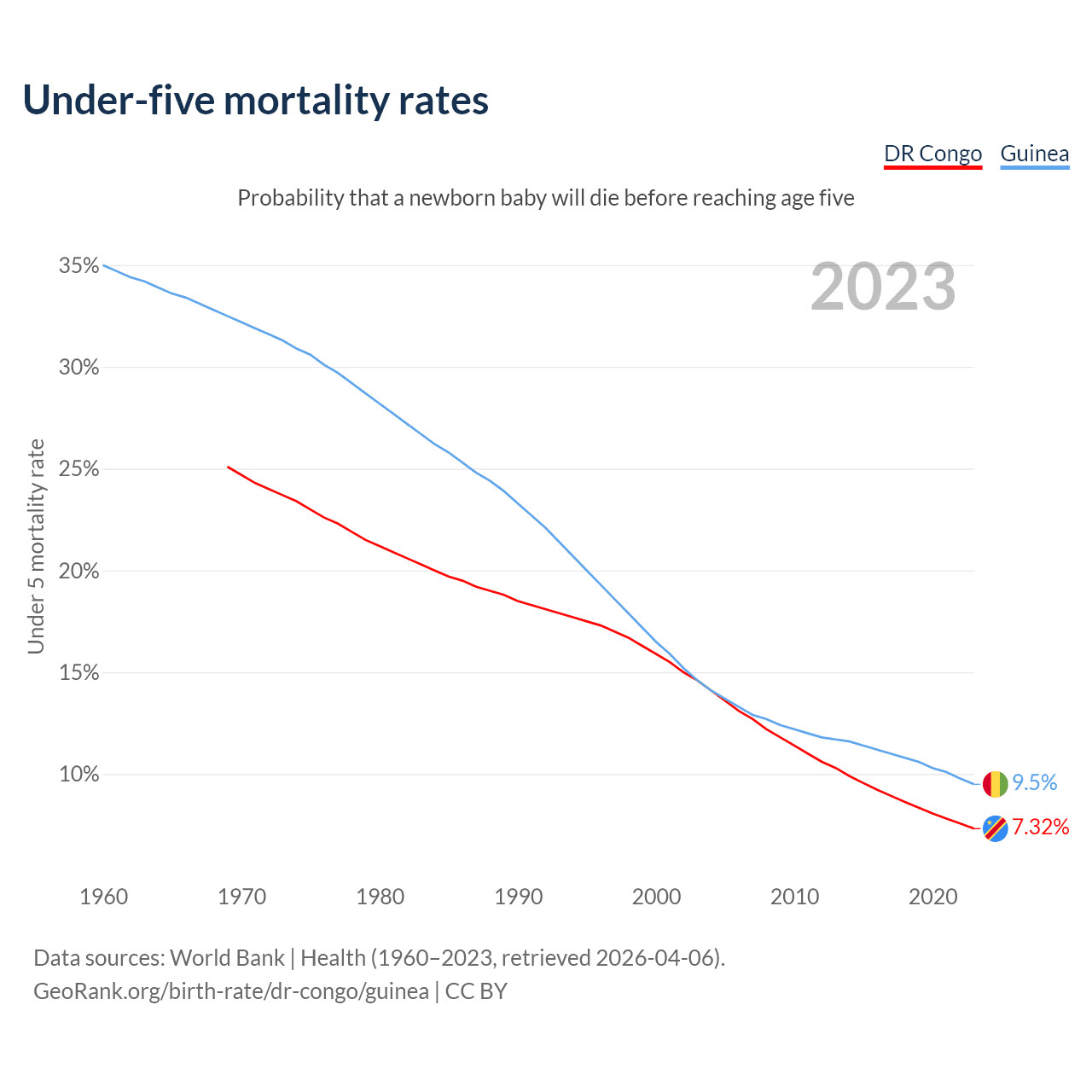 The chance that a newborn baby will die before reaching age five is 7.32% in the DR Congo and 9.5% in Guinea. Above is a chart with historical data on under-five mortality rates.