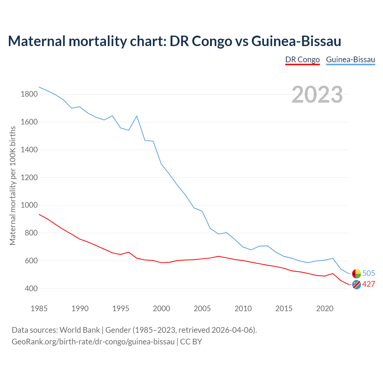The maternal mortality rate, which is the probability of dying during childbirth or within 42 days of pregnancy termination, is 427 deaths per 100,000 live births in the DR Congo, compared to 505 deaths in Guinea-Bissau.