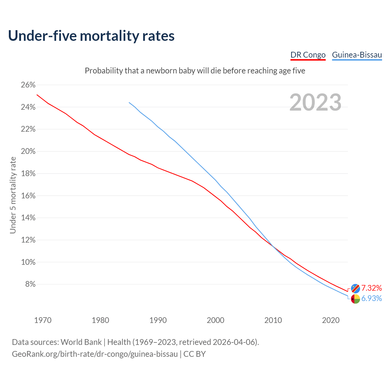 The chance that a newborn baby will die before reaching age five is 7.32% in the DR Congo and 6.93% in Guinea-Bissau. Above is a chart with historical data on under-five mortality rates.