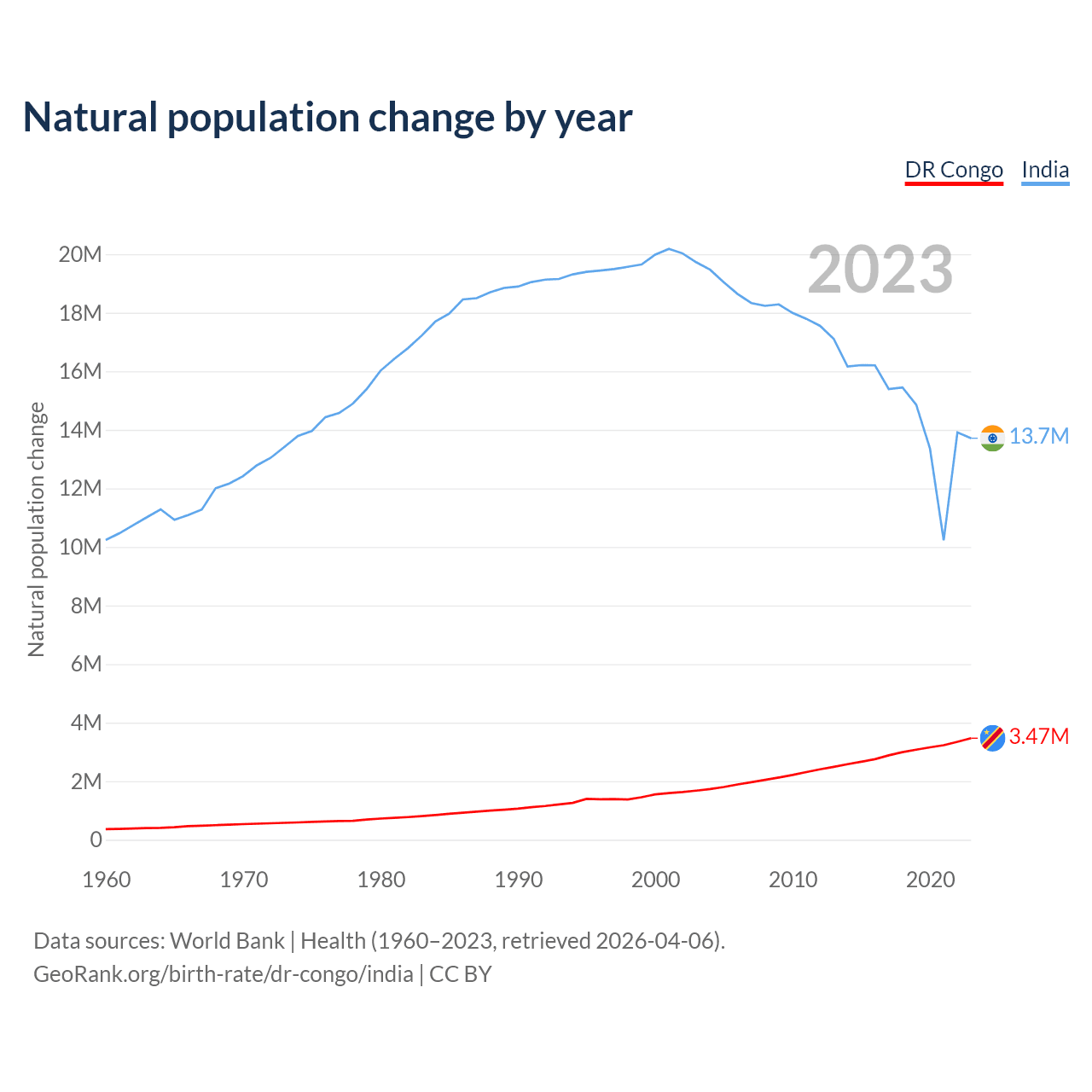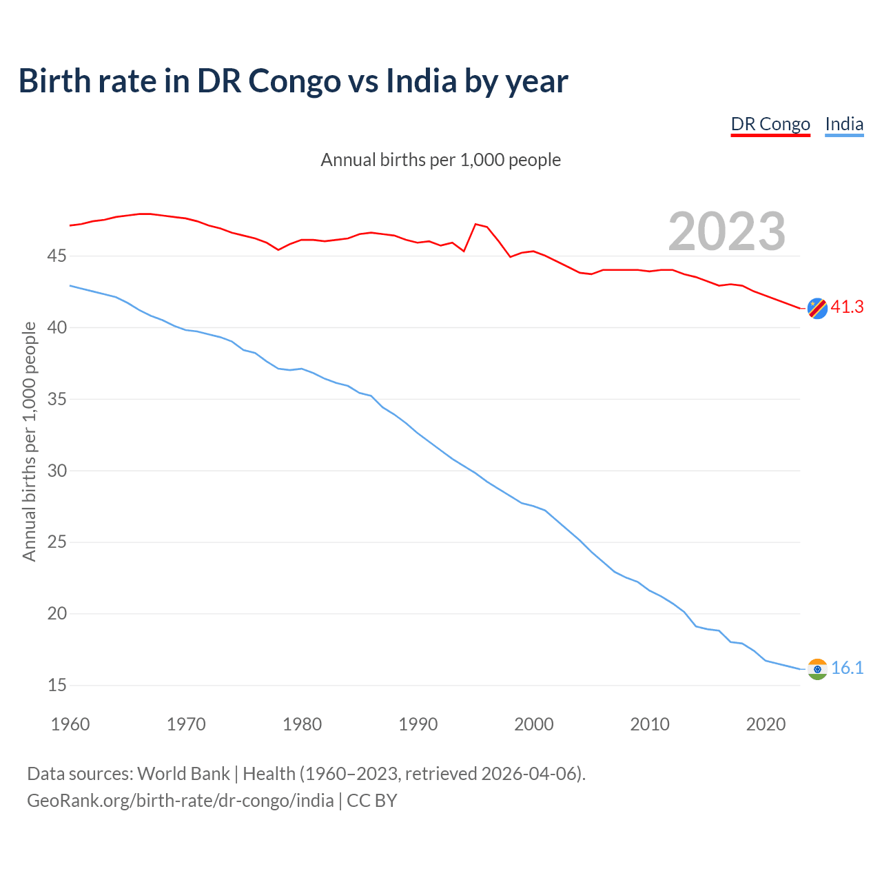 The DR Congo has an annual birth rate of 41.3 births per 1,000 people, compared to 16.1 for India. The average number of children a woman is expected to have during her lifetime — the fertility rate, is 6.05 in the DR Congo and 1.98 in India — 67.4% difference.