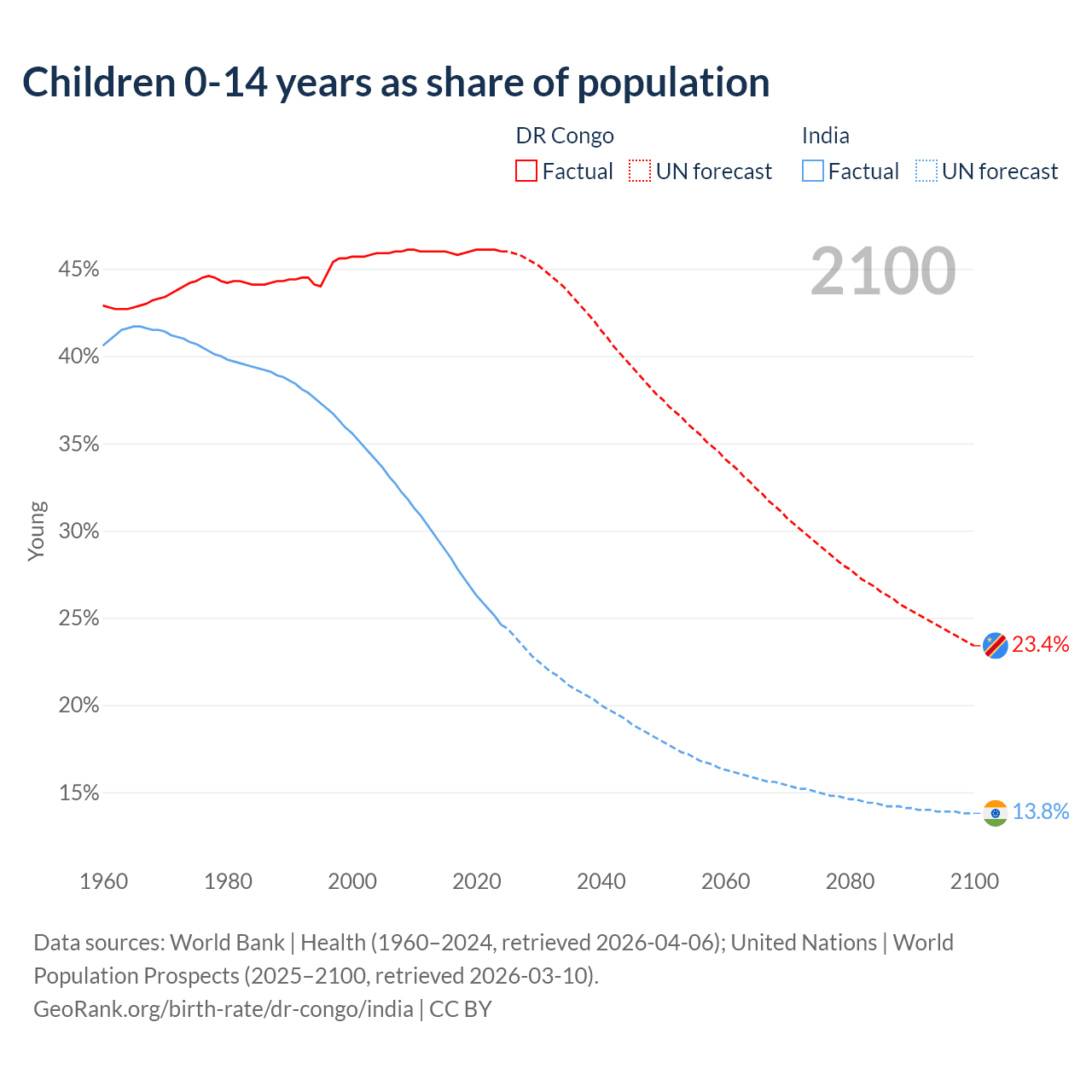 According to the latest available data on birth rates, the fertility rate in the DR Congo was 6.05 children per woman in 2023, compared to 1.98 in India in 2023. The replacement level is considered to be 2.1 children per woman.