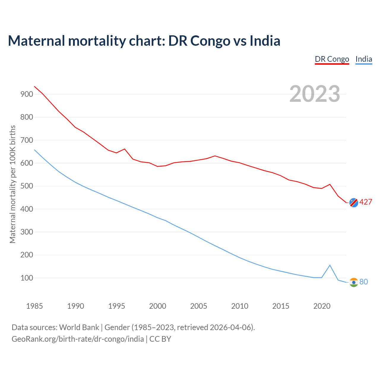 The maternal mortality rate, which is the probability of dying during childbirth or within 42 days of pregnancy termination, is 427 deaths per 100,000 live births in the DR Congo, compared to 80 deaths in India.