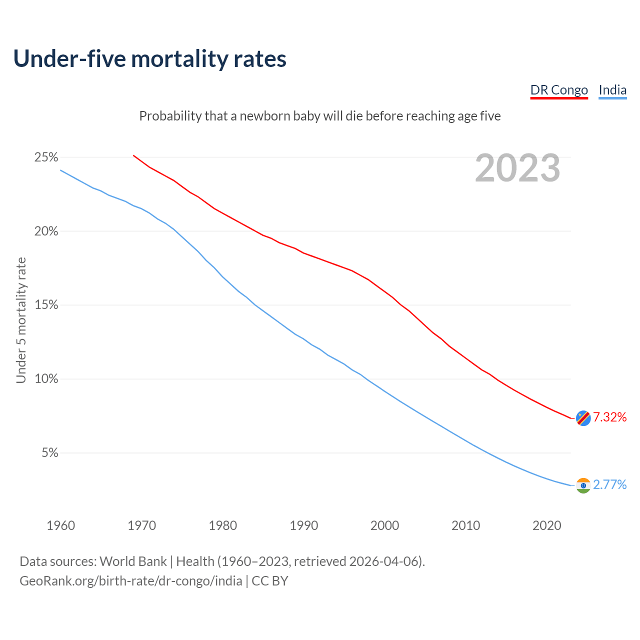 The chance that a newborn baby will die before reaching age five is 7.32% in the DR Congo and 2.77% in India. Above is a chart with historical data on under-five mortality rates.